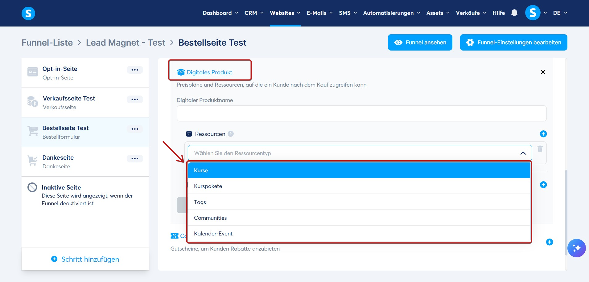 Nachdem Sie den Angebotstyp für Ihre Bestellformular-Seite ausgewählt haben, müssen Sie eine Ressource hinzufügen, auf die Ihre Kunden nach der Zahlung zugreifen können.