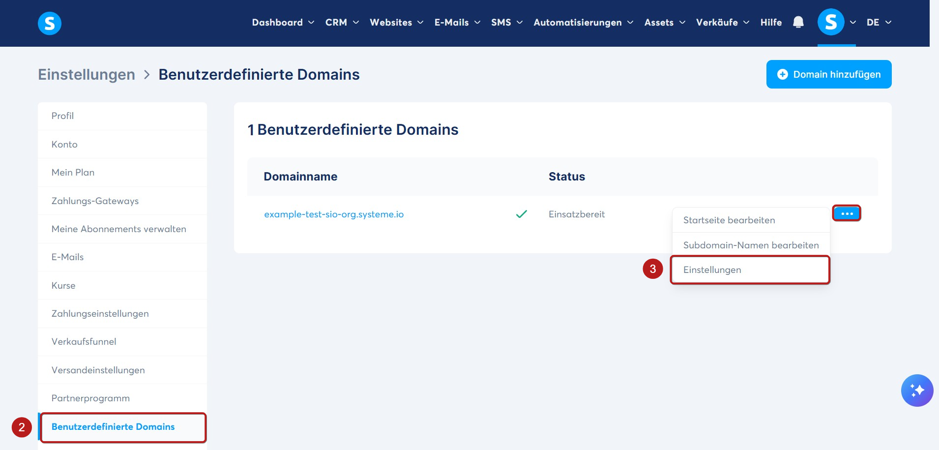 Klicken Sie anschließend auf Benutzerdefinierte Domains (2). Klicken Sie dann auf die drei Punkte (...) und wählen Sie Einstellungen (3), um Ihre Domain-Einstellungen zu verwalten.