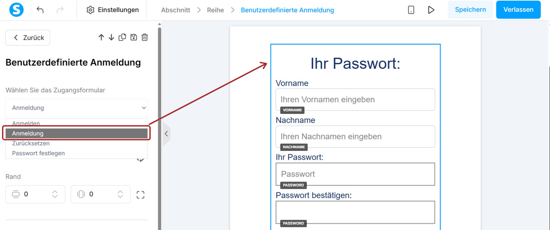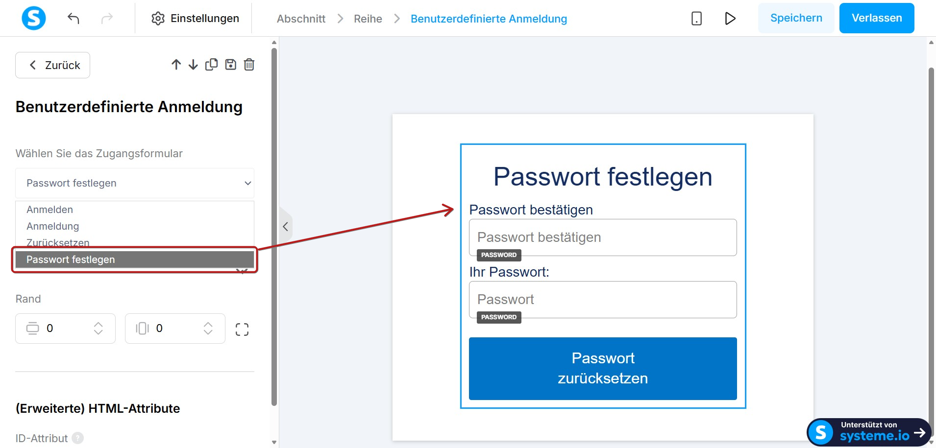 Um das Formular zur Passwortfestlegung zu bearbeiten, wählen Sie Passwort festlegen und passen Sie es mit den Elementen des Editors an.