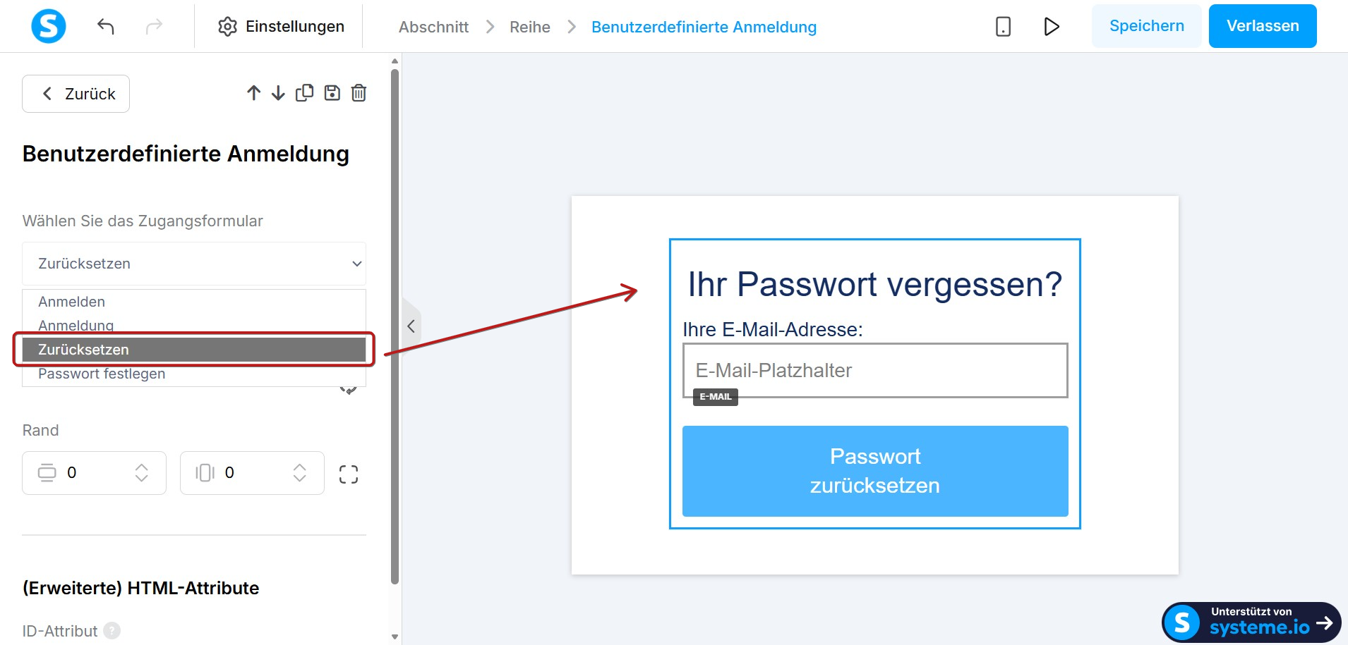 Um das Formular zum Zurücksetzen des Passworts zu ändern, wählen Sie Zurücksetzen und bearbeiten Sie das Formular mit den bereitgestellten Elementen.