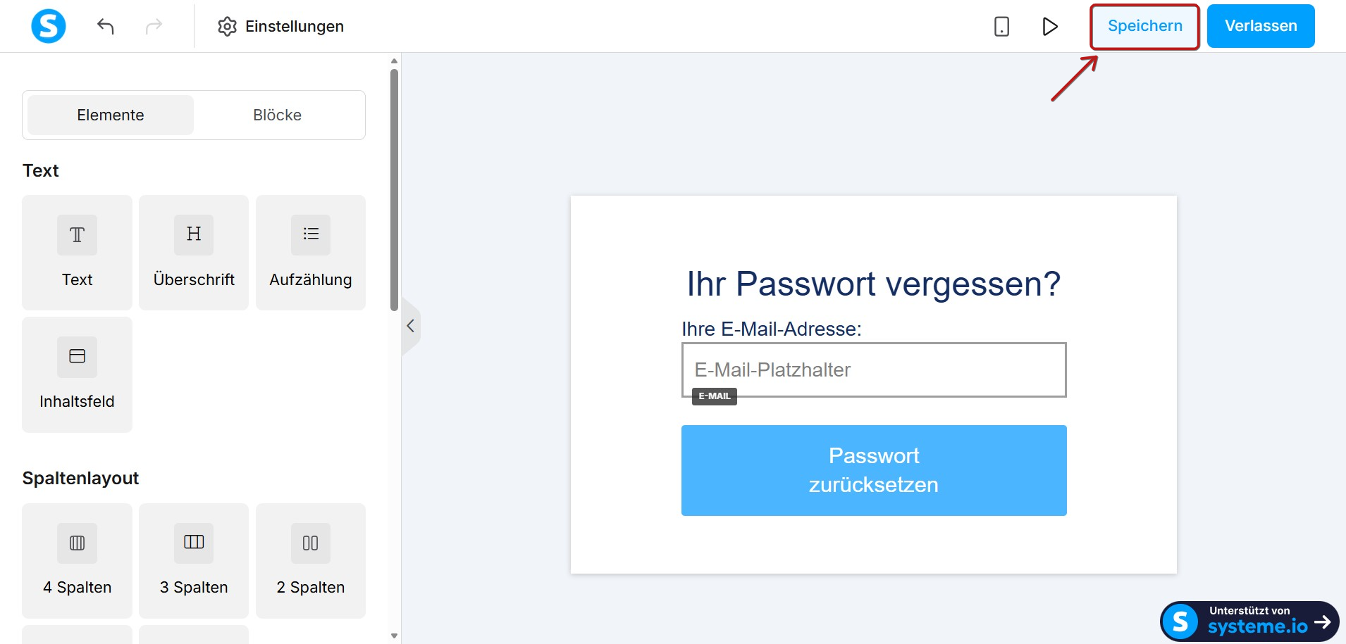 Nachdem Sie die Bearbeitung abgeschlossen haben, klicken Sie oben rechts auf Speichern, um Ihre Änderungen zu übernehmen. Sobald die Änderungen gespeichert sind, kann die alte Version der Seite nicht wiederhergestellt werden.