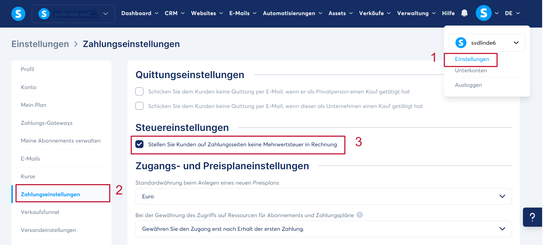 Aktivieren Sie die Option „Stellen Sie Kunden auf Zahlungsseiten keine Mehrwertsteuer in Rechnung“ ( 3).