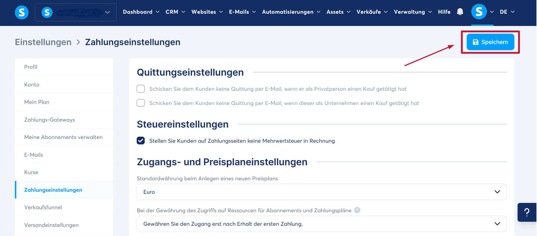Klicken Sie oben rechts in den Zahlungseinstellungen auf „Speichern“, um die Änderungen zu sichern.