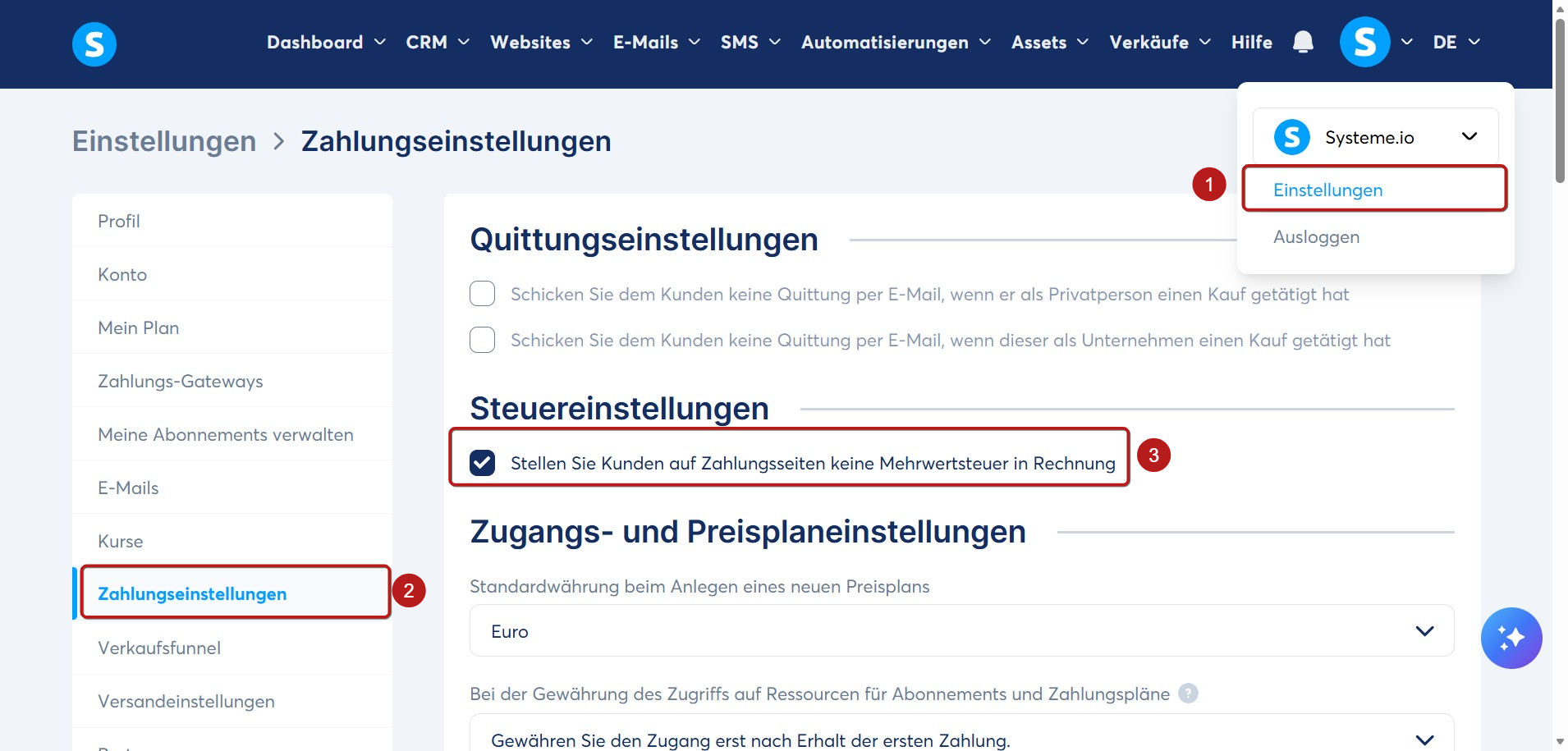 Aktivieren Sie die Option Stellen Sie Kunden auf Zahlungsseiten keine Mehrwertsteuer in Rechnung (3).