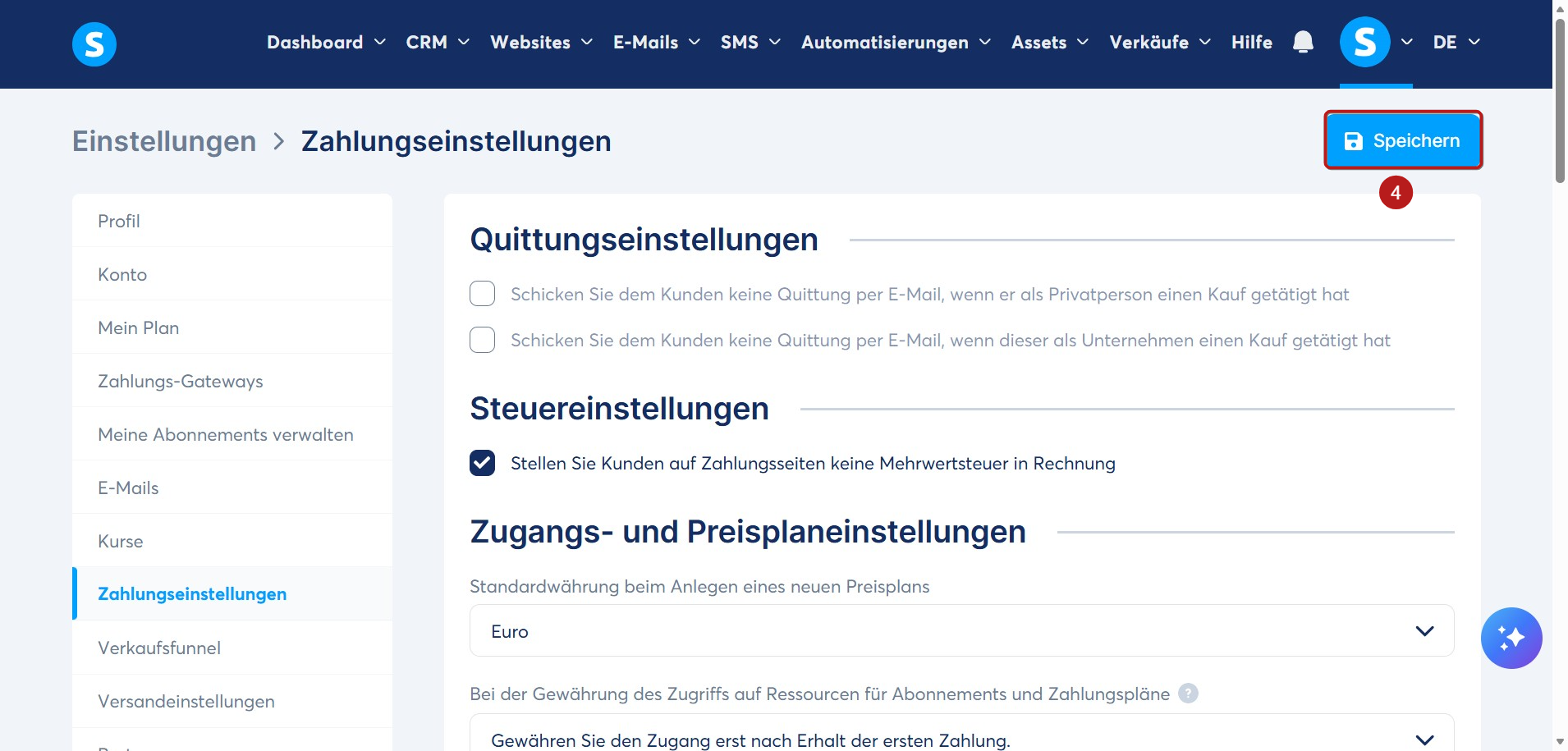 Klicken Sie oben in den Zahlungsseiteneinstellungen auf Speichern (4), um die Änderungen zu sichern.