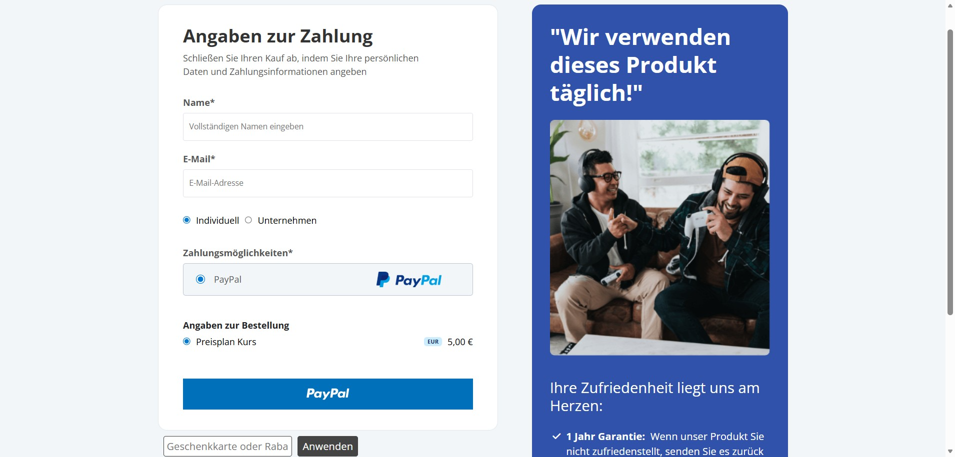 Füllen Sie das Bestellformular aus und klicken Sie auf die Schaltfläche, um Ihren Testkauf abzuschließen.