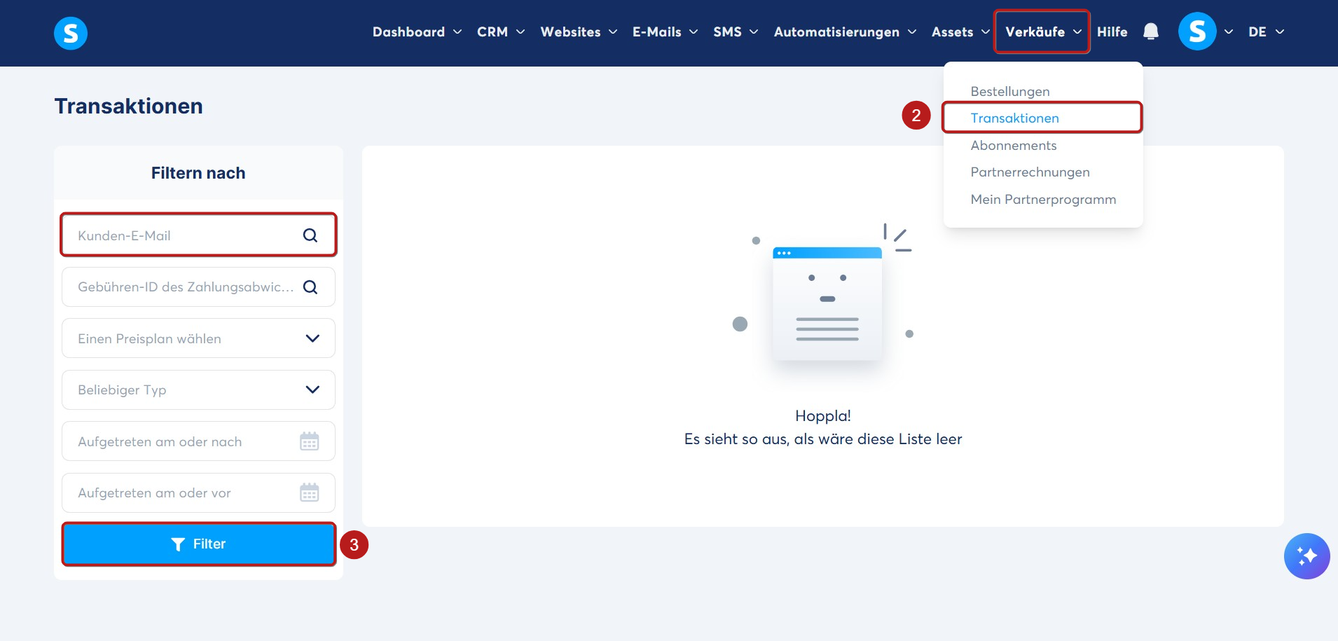 Standardmäßig werden alle Transaktionen angezeigt. Sie können die Transaktionen auch nach E-Mail-Adresse, Produktname oder Datumsbereich filtern. Nach der entsprechenden Auswahl klicken Sie auf Filter (3).