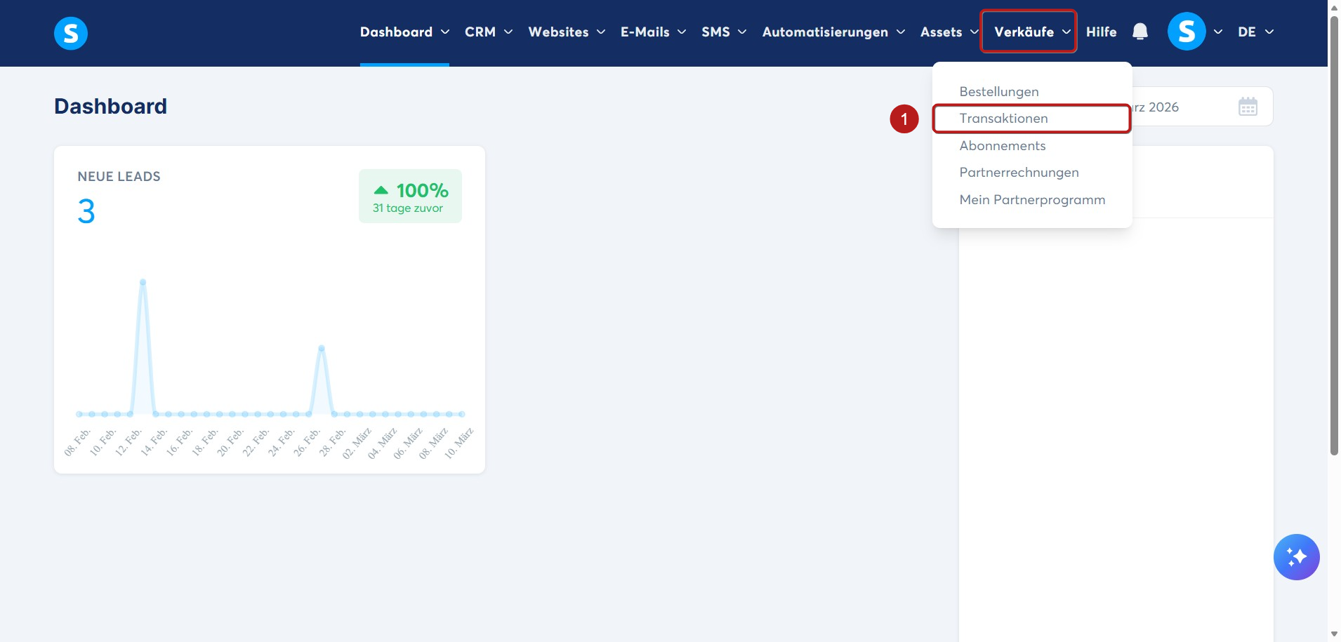 Um einem Kunden eine Rückerstattung zu gewähren, gehen Sie zu Verkäufe und anschließend zu Transaktionen (1).