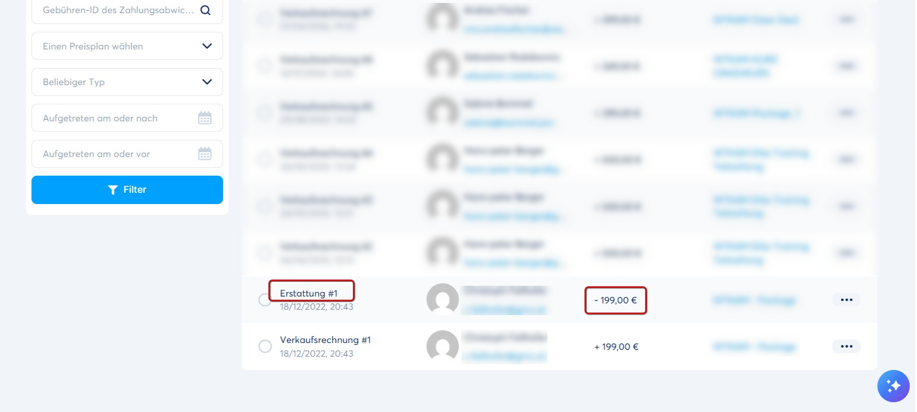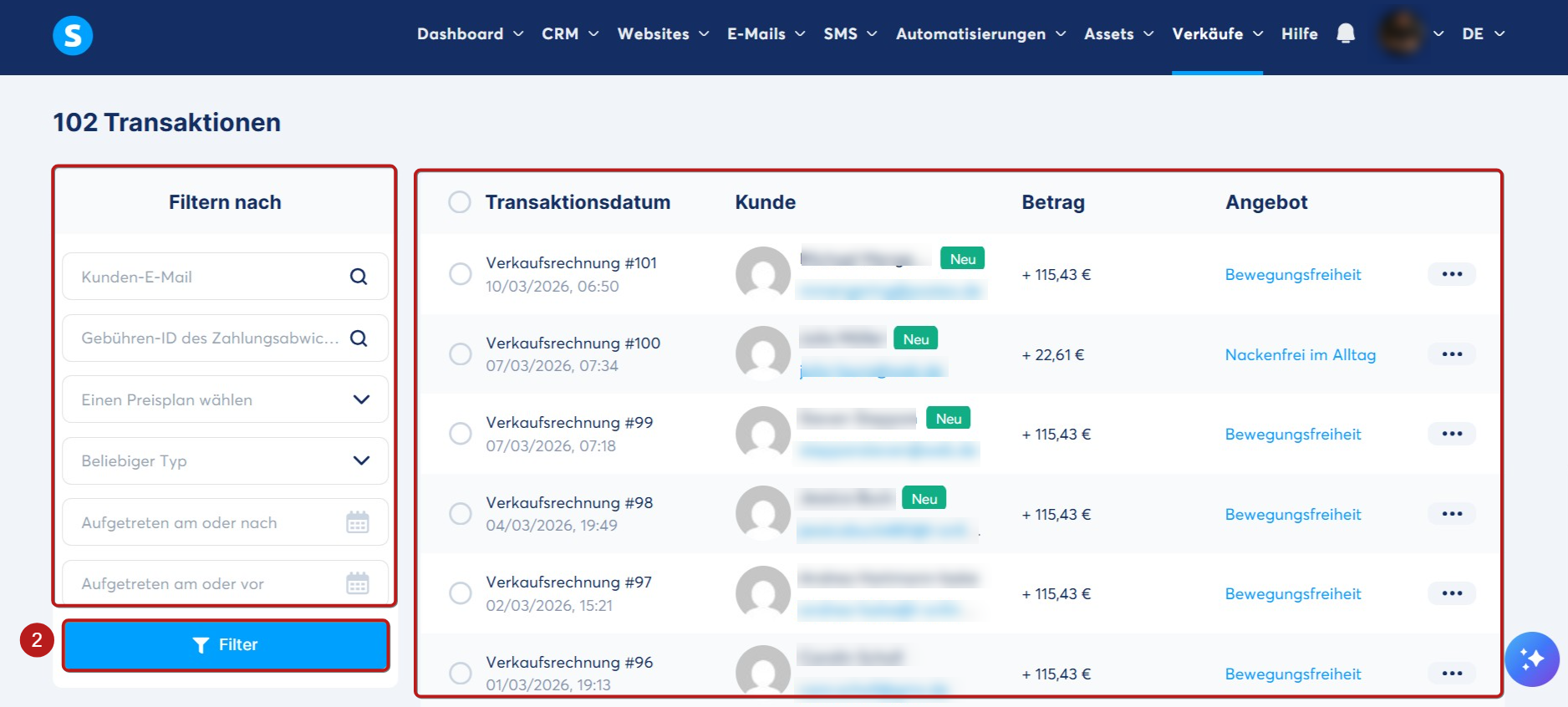 Sie können nach einer Transaktion suchen, indem Sie die E-Mail-Adresse des Kunden eingeben, den gewählten Preisplan auswählen oder einen Datumsbereich festlegen. Klicken Sie anschließend auf Filter (2), um die Ergebnisse anzuzeigen.