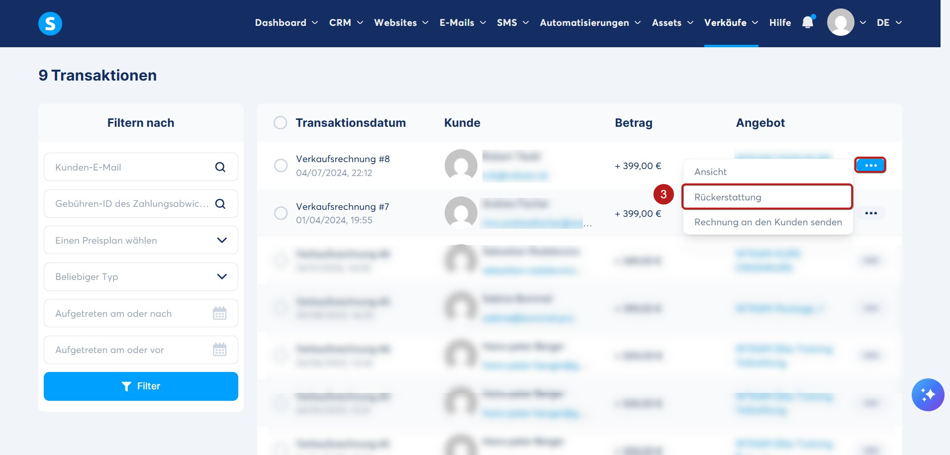 Sobald die Transaktion angezeigt wird, klicken Sie auf das Drei-Punkte-Menü und anschließend auf Rückerstattung (3). Bestätigen Sie die Rückerstattung, um den Vorgang abzuschließen.