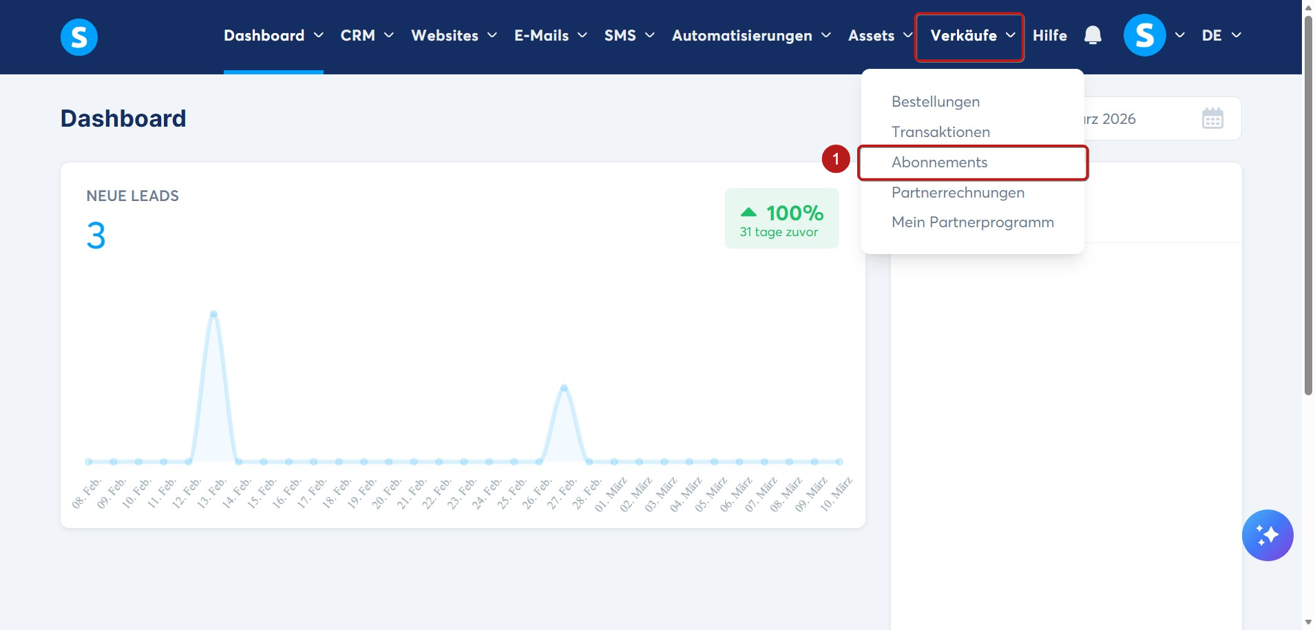 Gehen Sie zu Verkäufe (1) und klicken Sie auf Abonnements (2).