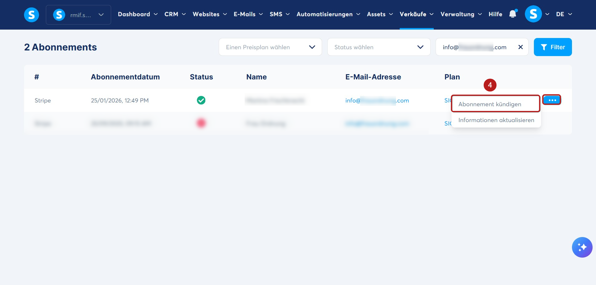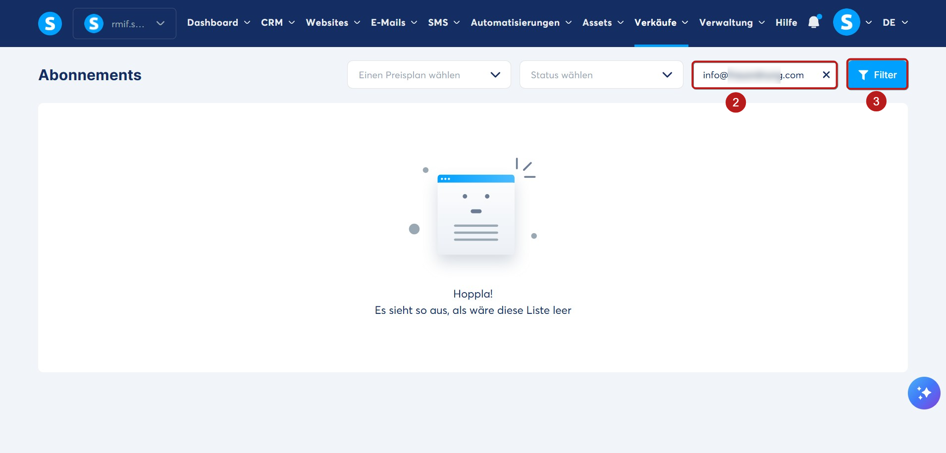 Geben Sie im Suchfeld die E-Mail-Adresse des Abonnenten ein (2) und klicken Sie anschließend auf Filter (3).