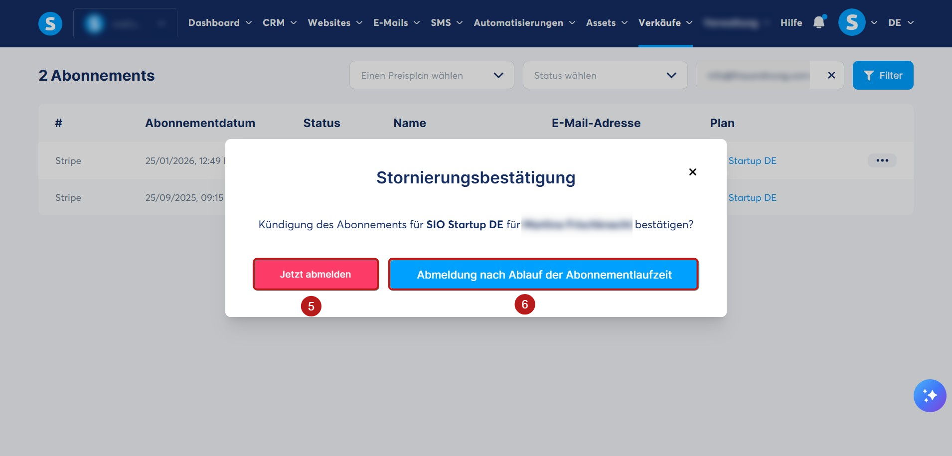 Beispiel: Wenn der Kunde am 1. Januar ein Abonnement abgeschlossen hat und Sie es am 15. Januar kündigen, verliert er den Zugriff noch am 15. Januar.