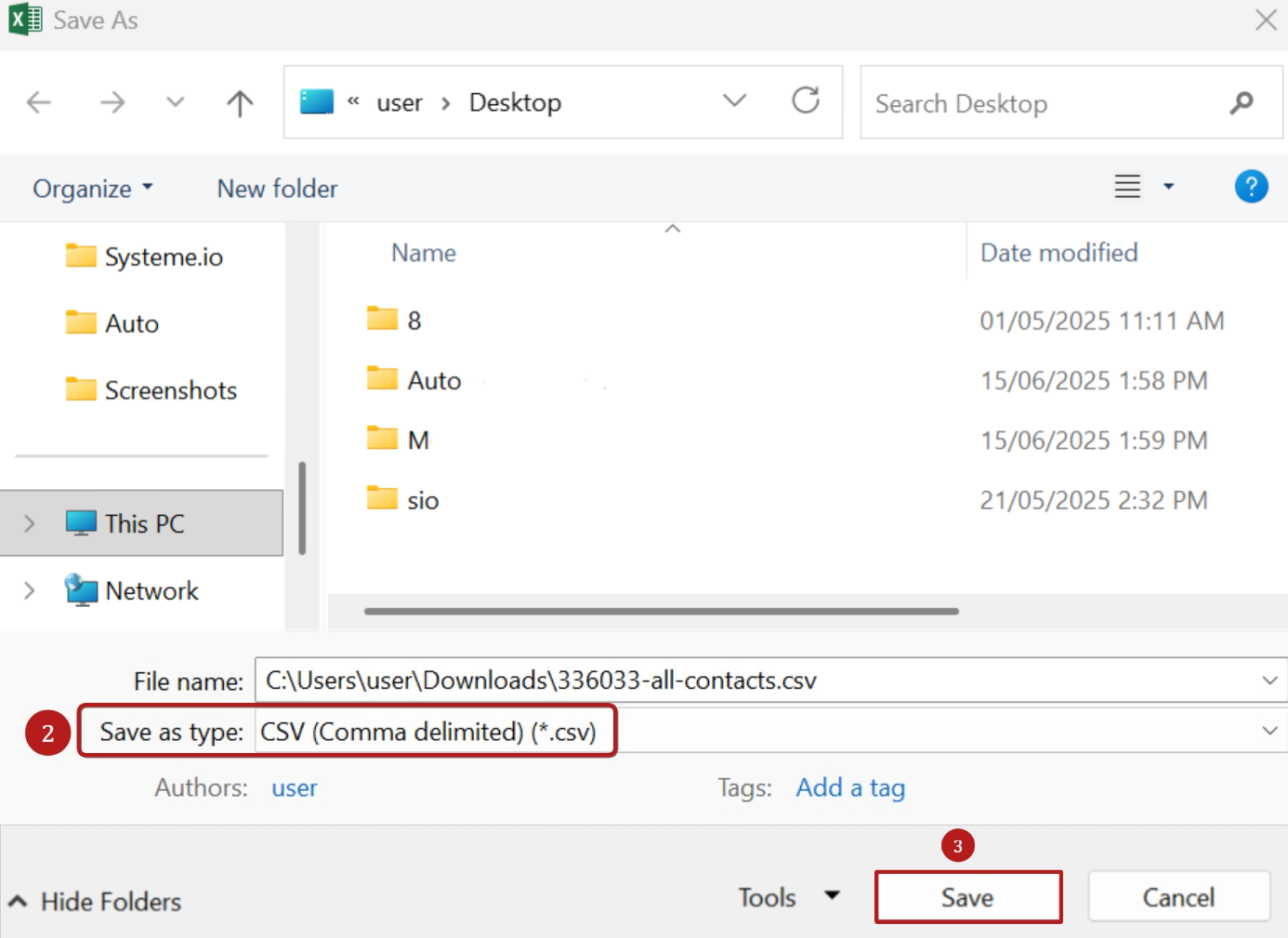 Klicken Sie auf „Speichern unter“ und wählen Sie den gewünschten Trenner aus (z. B. Komma) (2).