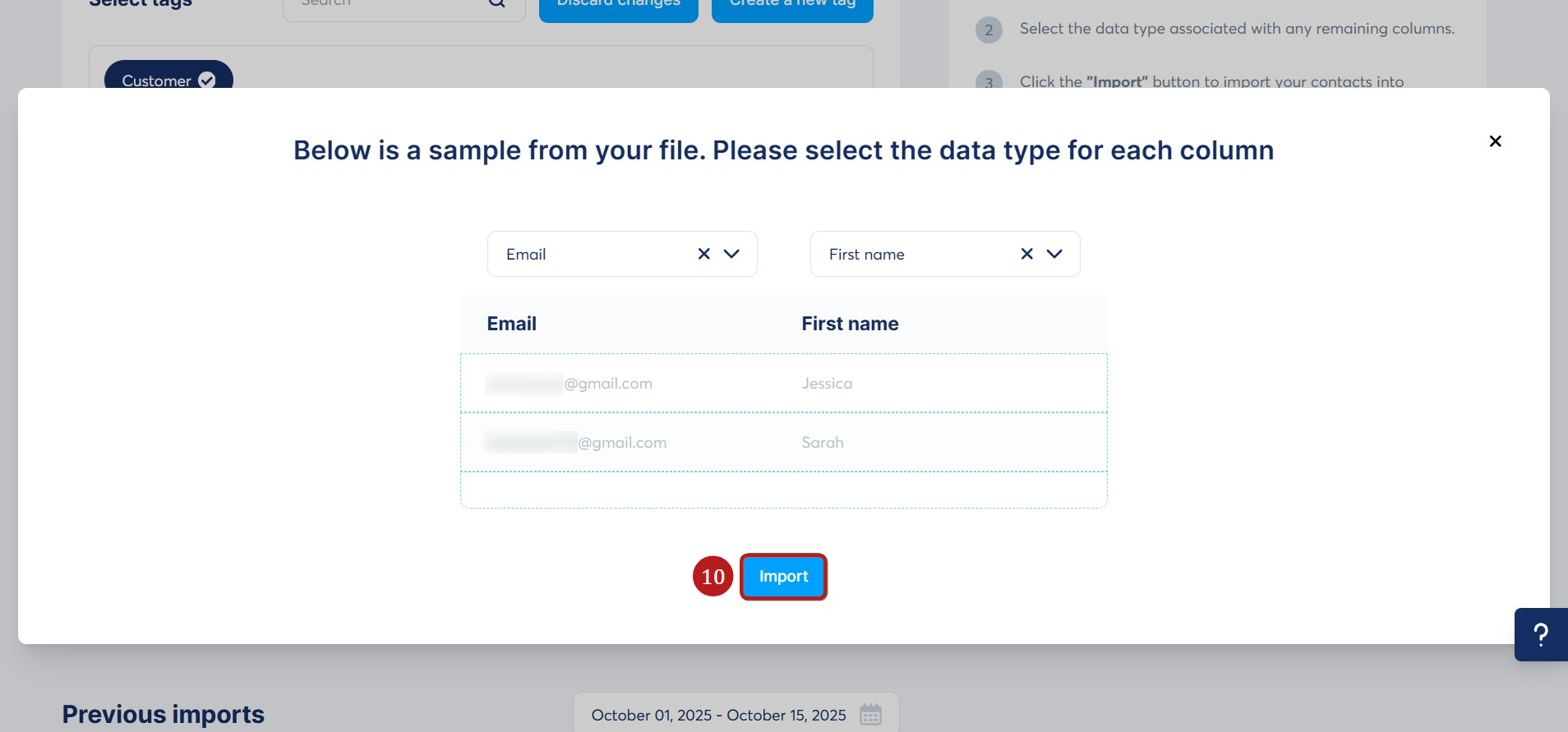 Nachdem Sie auf „Weiter“ geklickt haben, erscheint ein Pop-up, in dem Sie den Datentyp für jede Spalte auswählen können, z. B. E-Mail, Vorname oder andere relevante Spalten aus Ihrer Datei.
