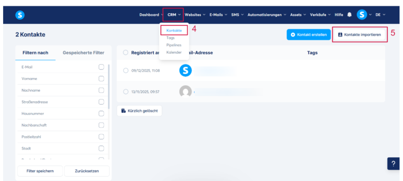 Gehen Sie im „CRM“-Tab zu „Kontakte“ (4) und klicken Sie dann auf die Schaltfläche „Kontakte importieren“ (5).