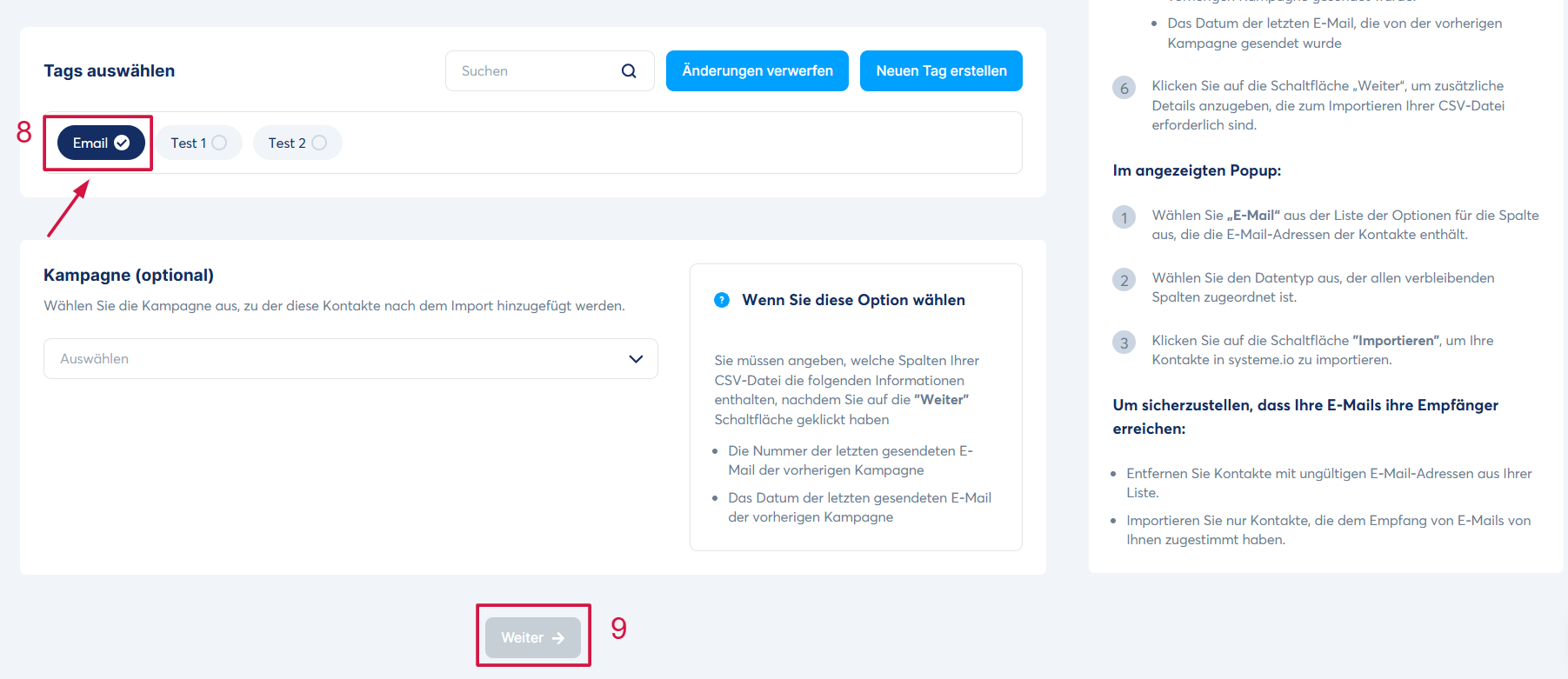 Sie können das Tag auswählen, das Sie diesen Kontakten zuweisen möchten (8), und anschließend auf „Weiter“ klicken (9).