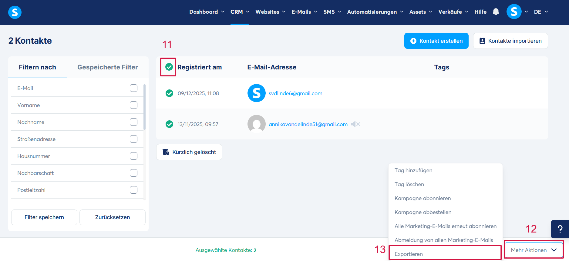 Wählen Sie die Kontakte aus, die Sie exportieren möchten (11), und klicken Sie anschließend auf „Weitere Aktionen“ (12). Wählen Sie in der Aktionsliste „Exportieren“ (13) aus.
