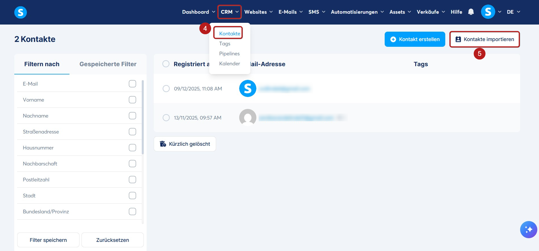 Gehen Sie im CRM-Tab zu Kontakte (4) und klicken Sie anschließend auf Kontakte importieren (5).