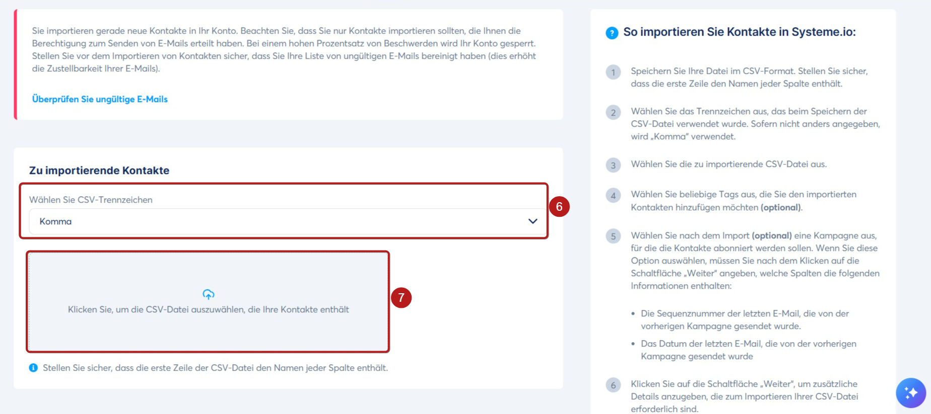 Gehen Sie zu Wählen Sie CSV-Trennzeichen (6), um das in Ihrer CSV-Datei verwendete Trennzeichen festzulegen (Komma, Semikolon oder Pipe). Klicken Sie anschließend auf den Hinweis: Klicken Sie hier, um die CSV-Datei auszuwählen, die Ihre Kontakte enthält (7), um Ihre Datei hochzuladen.
