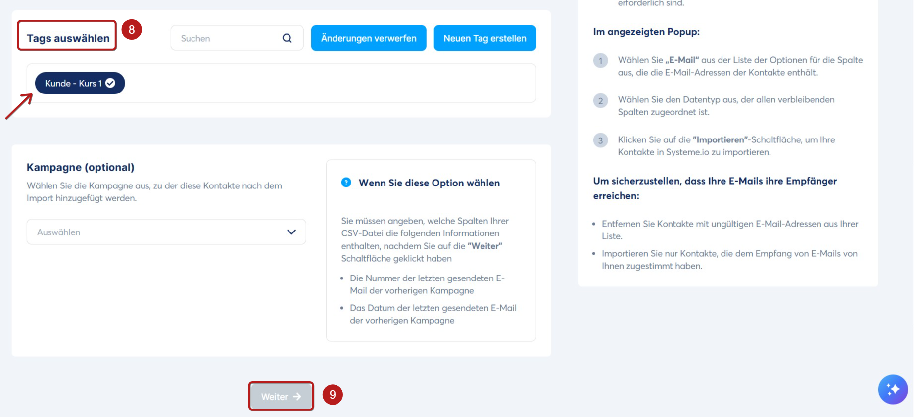 Sie können das Tag auswählen, das Sie diesen Kontakten zuweisen möchten (8), und klicken Sie anschließend auf Weiter (9).