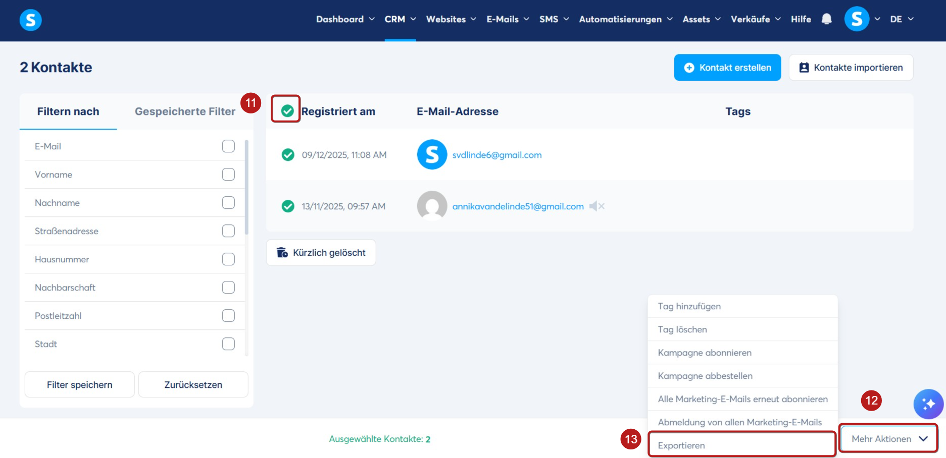 Wählen Sie die Kontakte aus, die Sie exportieren möchten (11), und klicken Sie dann auf Mehr Aktionen (12). Wählen Sie aus der Liste der Aktionen Exportieren (13).