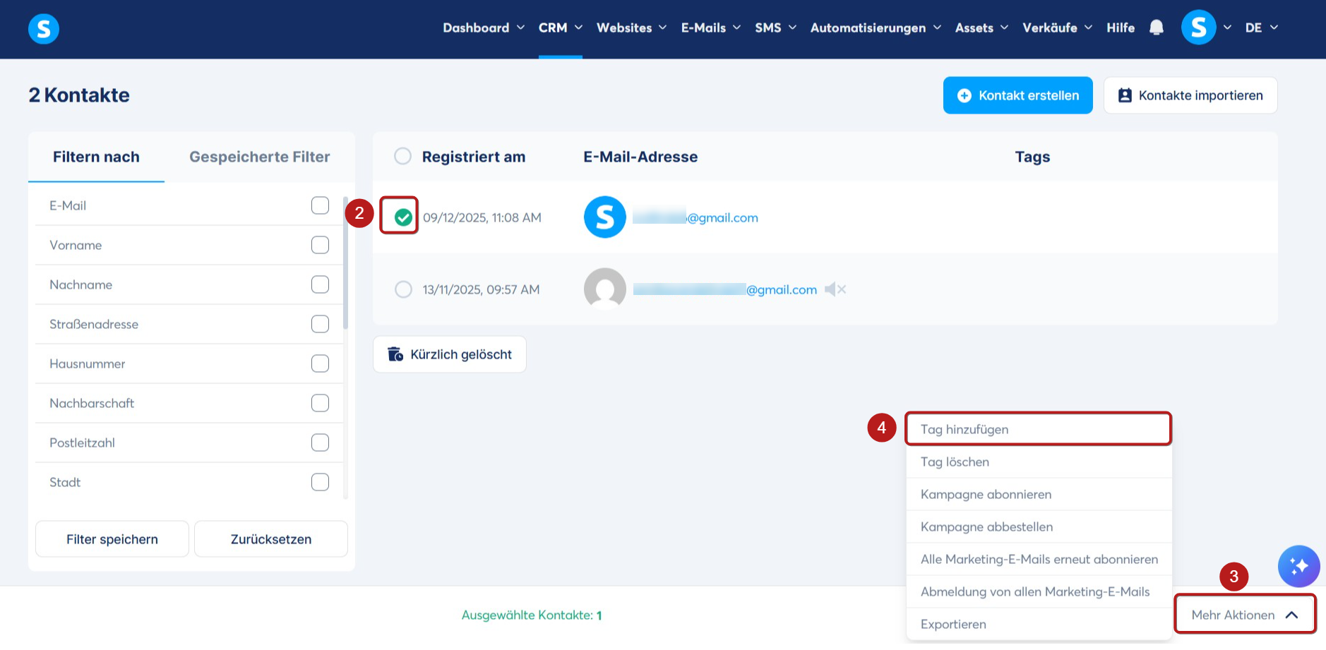 Wählen Sie die Kontakte aus, denen Sie ein Tag zuweisen möchten (2), klicken Sie anschließend auf Mehr Aktionen (3) und wählen Sie Tag hinzufügen (4).