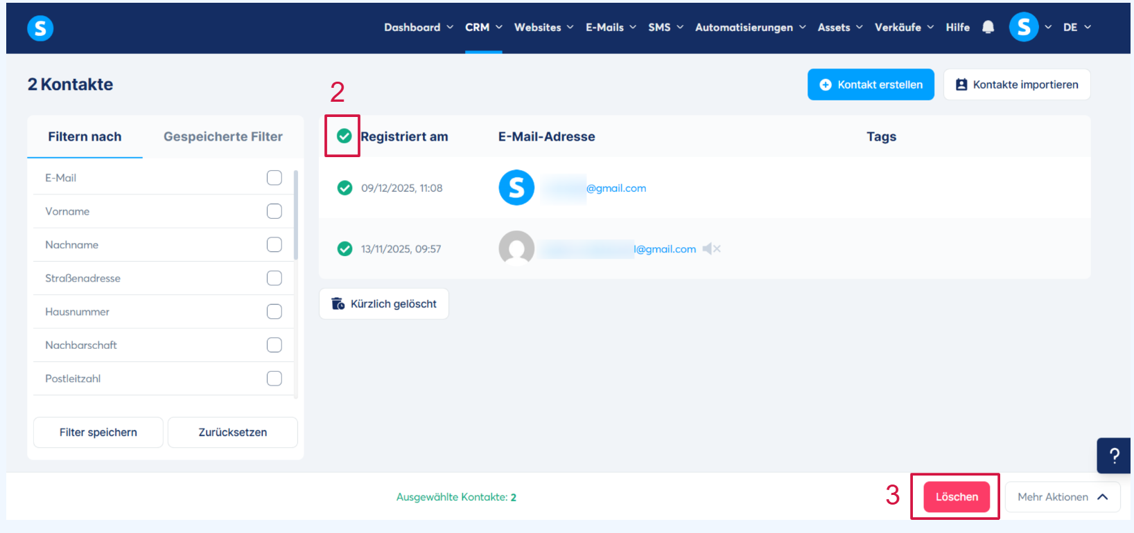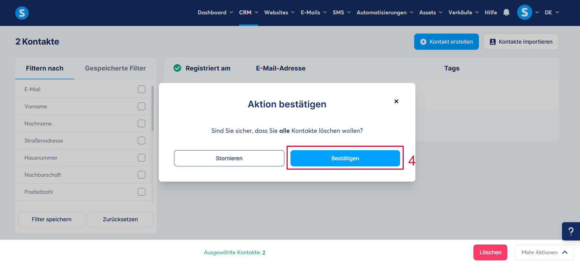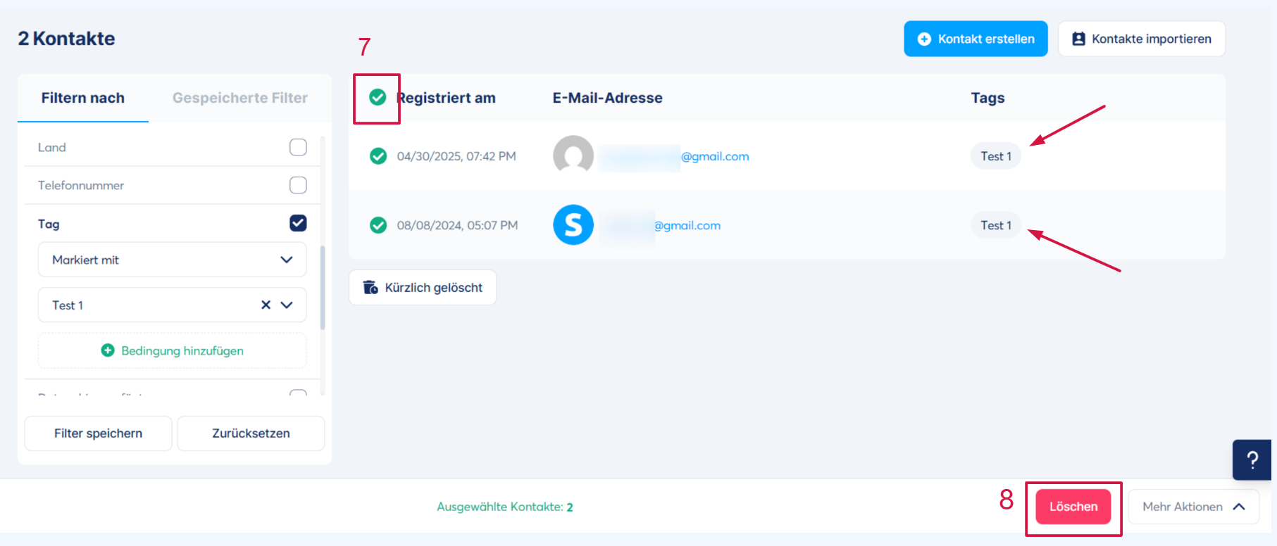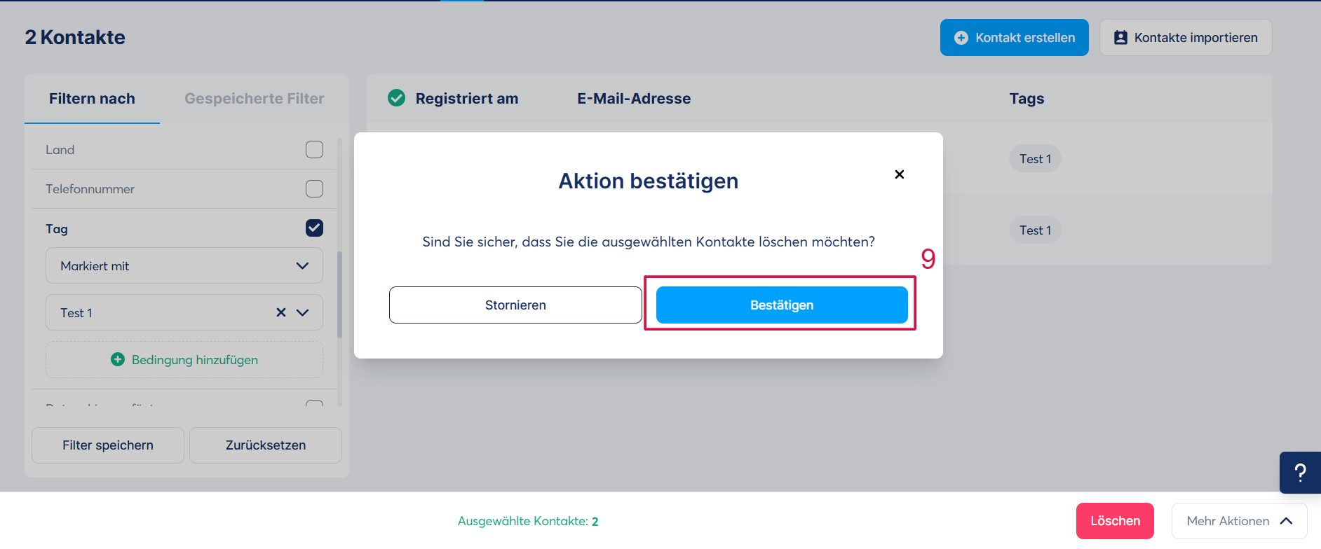 Klicken Sie auf Bestätigen (9), um die ausgewählten Kontakte zu löschen.