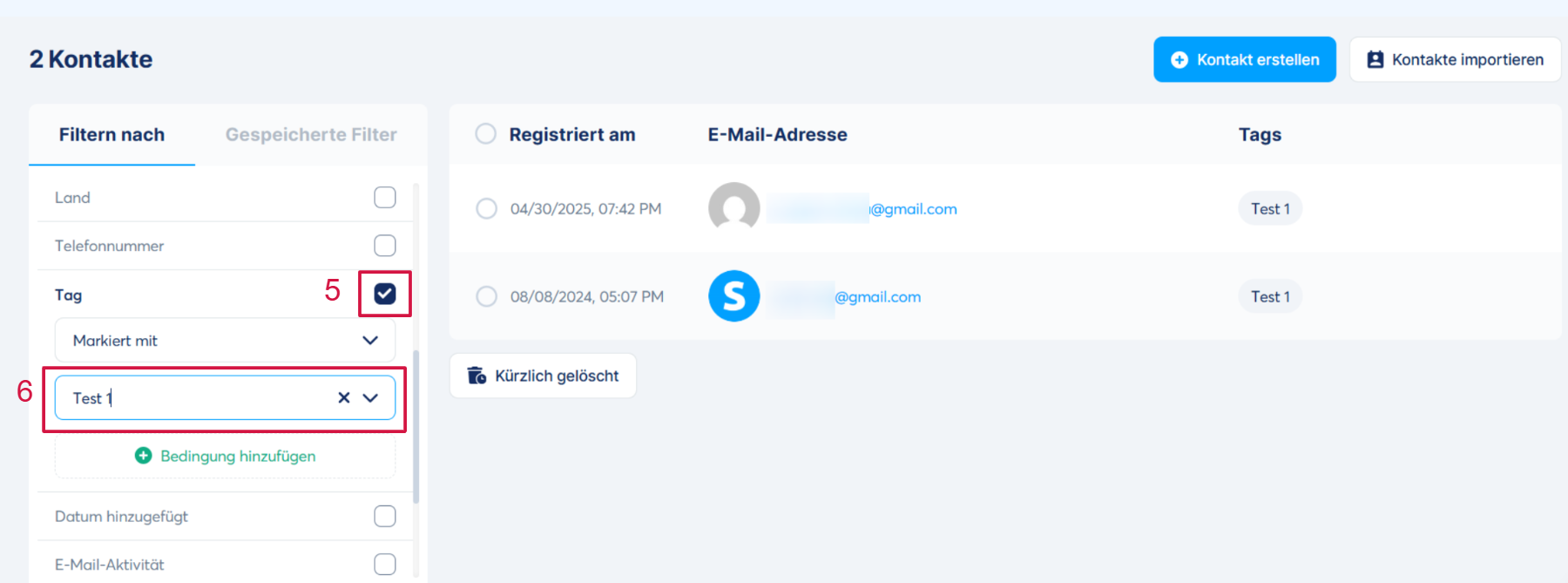 Verwenden Sie einen der Filter, um Ihre Kontakte zu gruppieren (z. B. nach „Tag“, „Hinzugefügt am“ usw.).