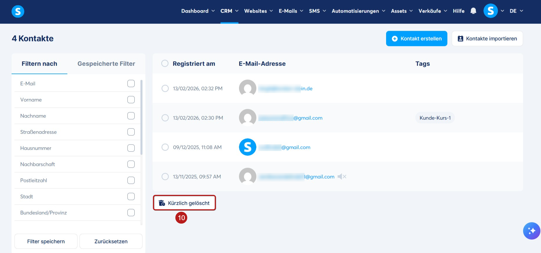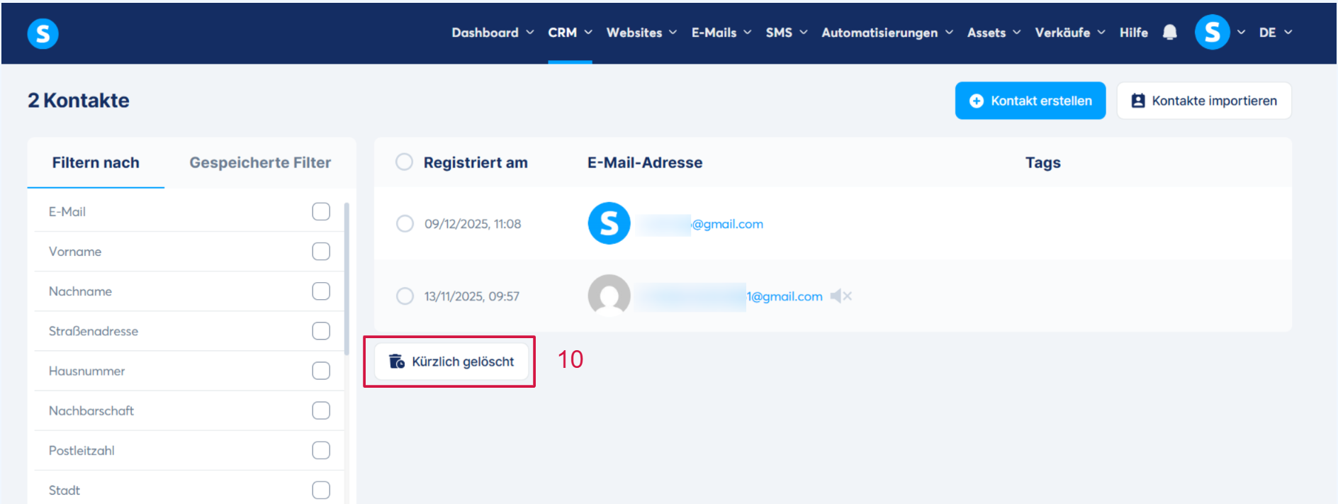 Um einen gelöschten Kontakt wiederherzustellen, klicken Sie auf Kürzlich gelöscht (10) auf Ihrer Kontaktseite.