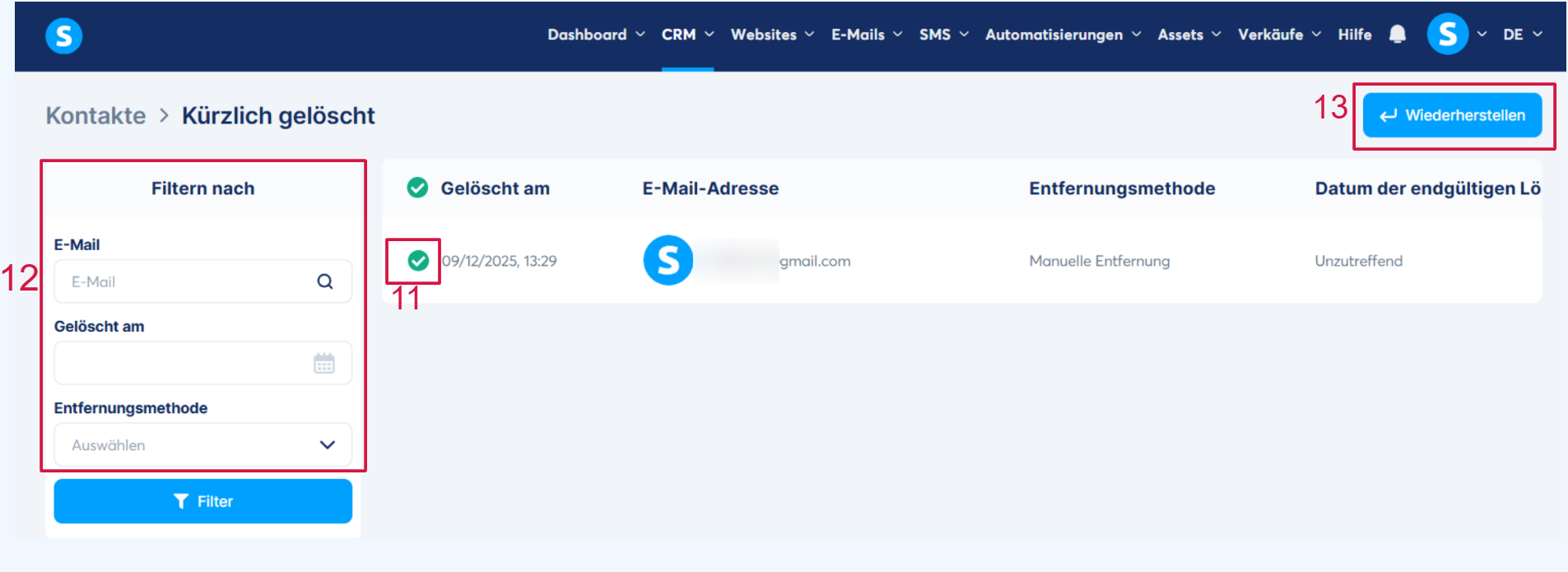 Sie können die Kontakte, die Sie wiederherstellen möchten, manuell auswählen (11) oder die Filter auf der linken Seite verwenden, um sie leichter zu finden (12).