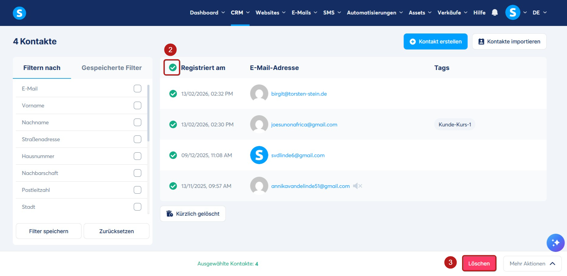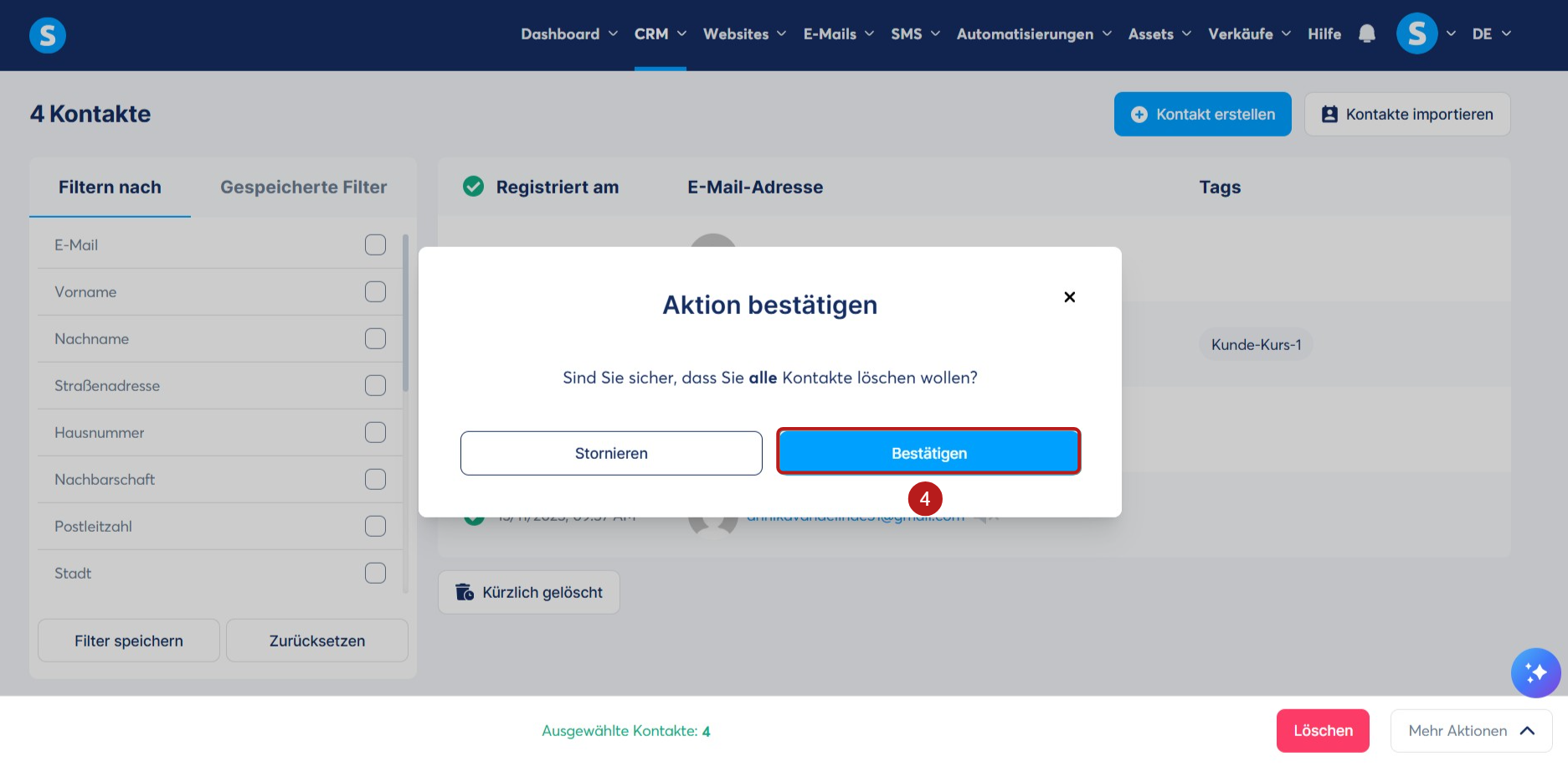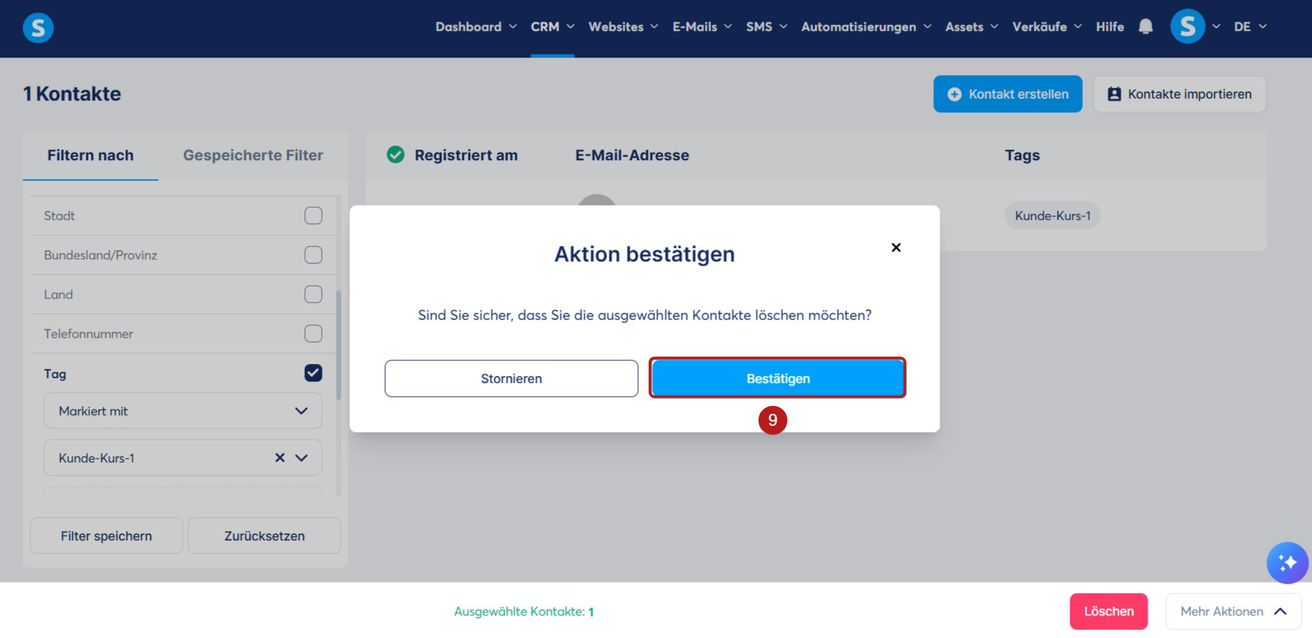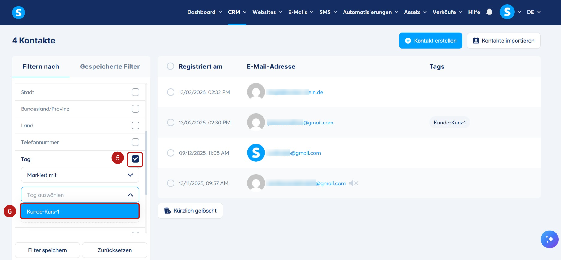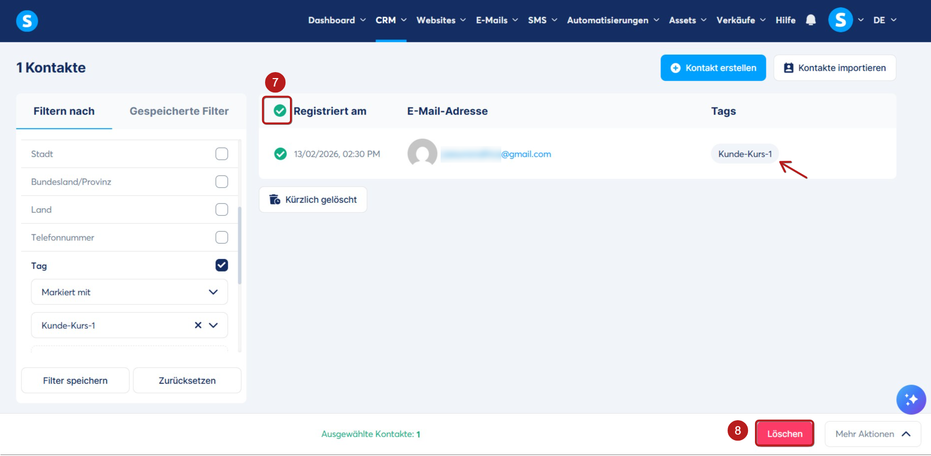 Beispielsweise, wenn Sie alle Kontakte mit dem Tag Kunde-Kurs-1 löschen möchten, wählen Sie den Tag-Filter (5) und anschließend Kunde-Kurs-1 aus der Tag-Liste (6) aus.
