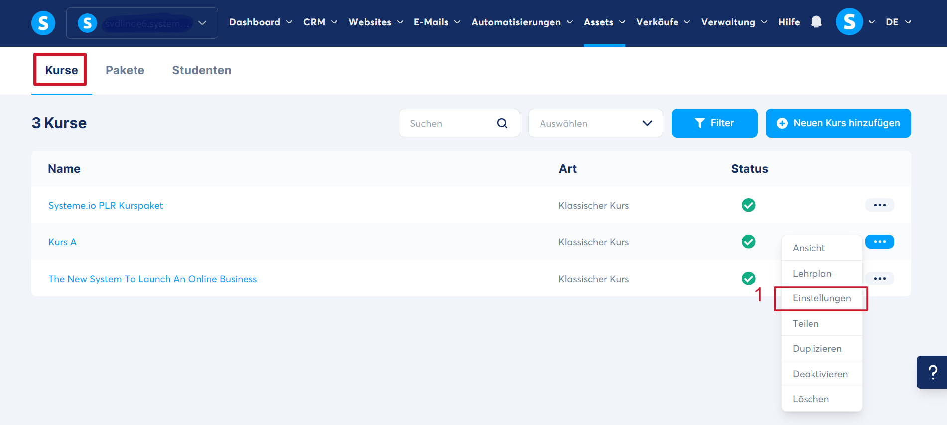 Um Informationen wie den Namen oder das Foto des Dozenten für jeden Kurs zu ändern, klicken Sie auf die 3 Punkte, um die Kurseinstellungen anzuzeigen, und klicken Sie auf „Einstellungen“ (1).