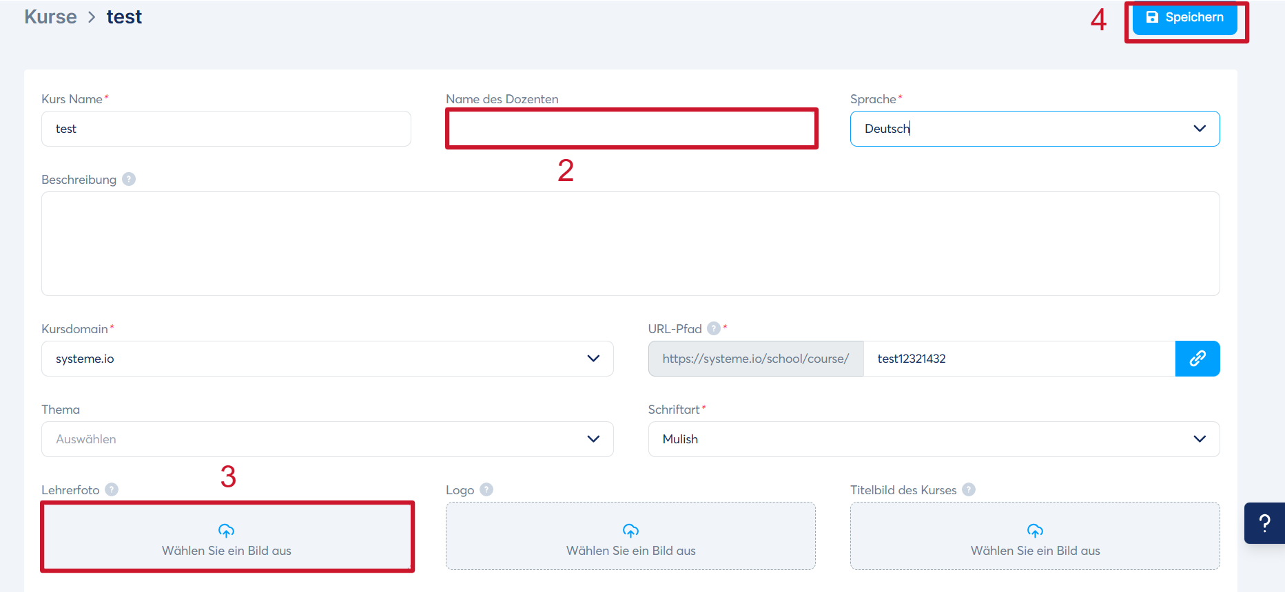 Ändern Sie den Namen und das Foto des Dozenten, die für diesen Kurs angezeigt werden sollen (2 und 3), und klicken Sie auf „Speichern“, um Ihre Änderungen zu bestätigen (4).