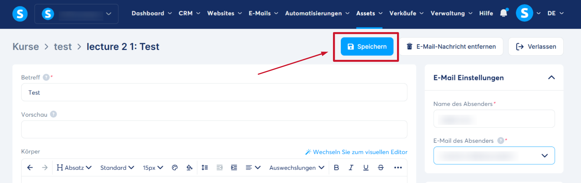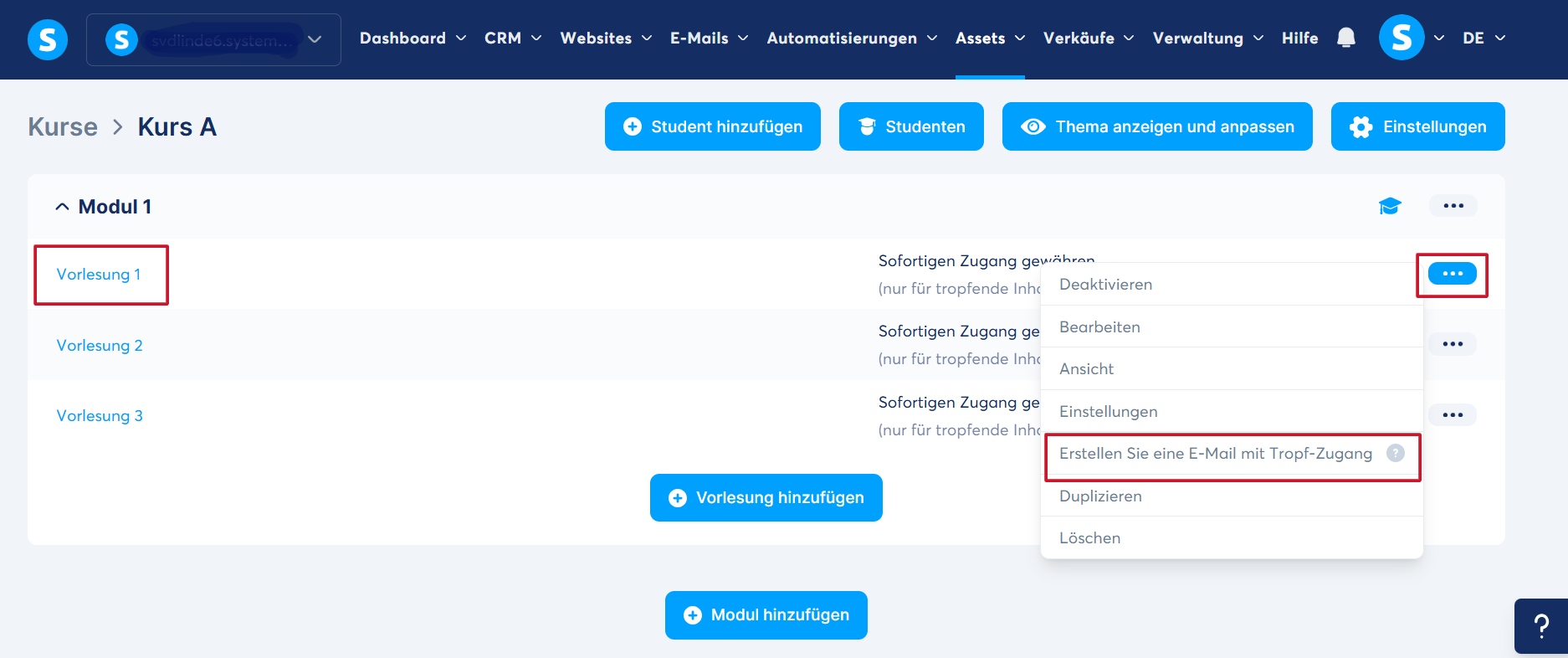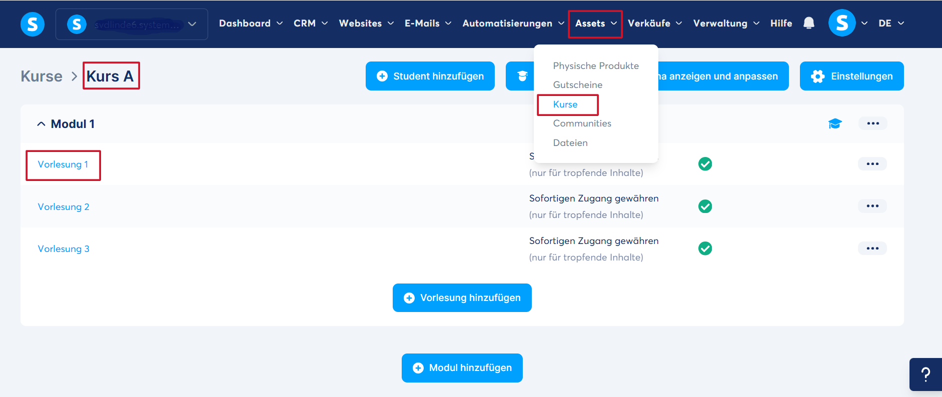 Klicken Sie dazu in der Navigationsleiste auf „Assets“ und dann auf „Kurse“. Gehen Sie anschließend zu der Vorlesung, für die Sie eine E-Mail einrichten möchten, die beim Freischalten versendet wird.