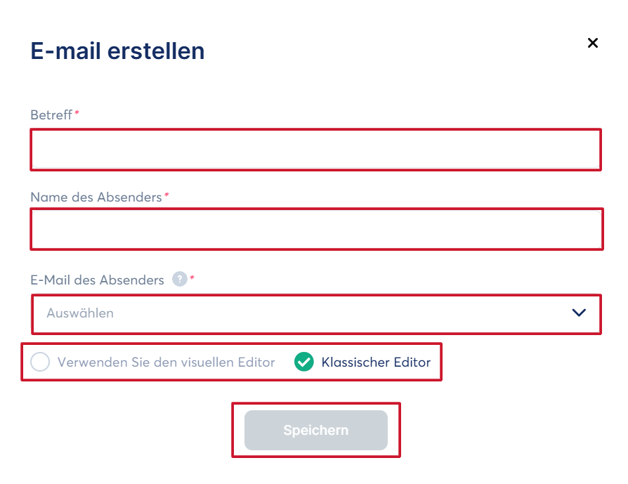 Im Pop-up-Fenster „E-Mail erstellen“, das erscheint, fügen Sie den Betreff, den Namen des Absenders und die E-Mail-Adresse des Absenders hinzu. Wählen Sie anschließend aus, welchen E-Mail-Editor Sie verwenden möchten: „Visueller Editor“ oder „Klassischer Editor“.