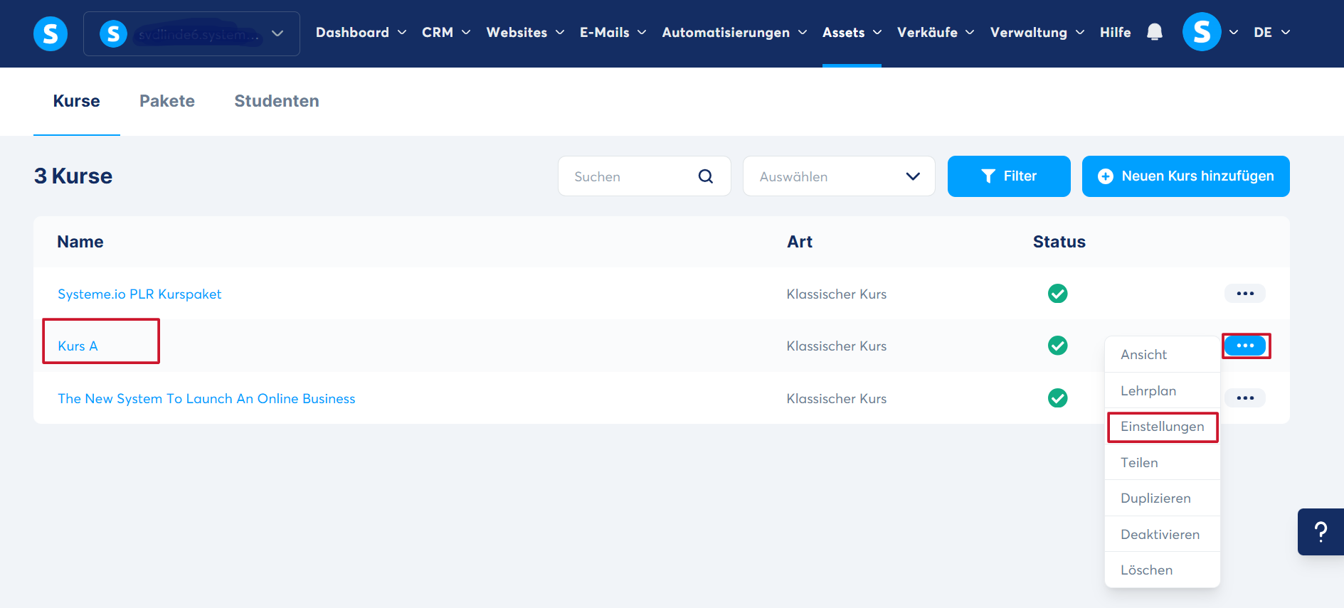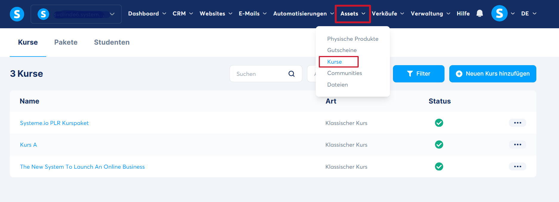 Gehen Sie zum Bereich „Kurse“, indem Sie auf Ihrem Dashboard auf die Registerkarte „Assets“ klicken und anschließend „Kurse“ auswählen.