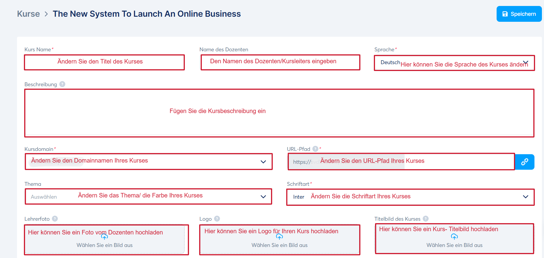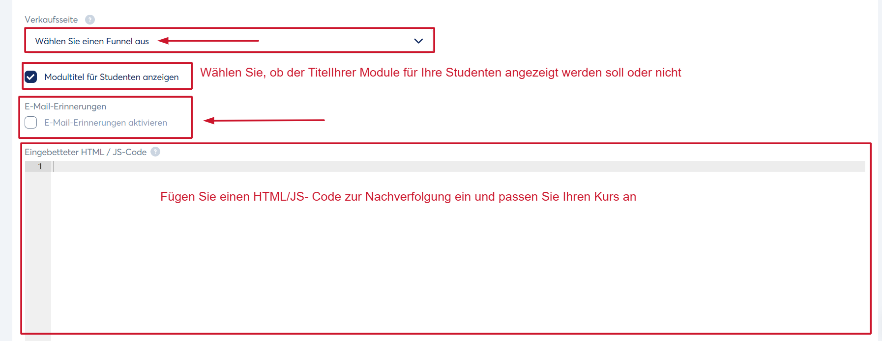 Passen Sie Ihre Kurseinstellungen nach Bedarf an, wie in den folgenden Abbildungen gezeigt: