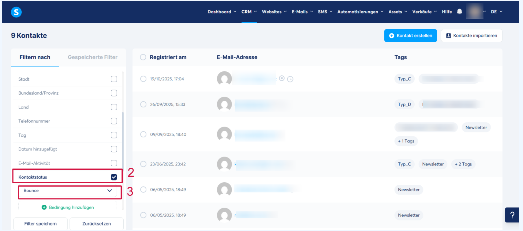 Klicken Sie auf den Filter „Kontaktstatus“ (2) und wählen Sie „Bounced“ (3) aus.