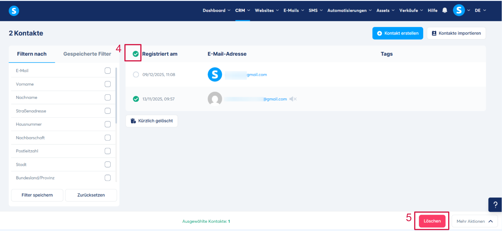Wählen Sie alle zurückgekehrten (bounced) Kontakte aus, indem Sie das Kontrollkästchen (4) anklicken, und klicken Sie anschließend auf „Löschen“ (5).