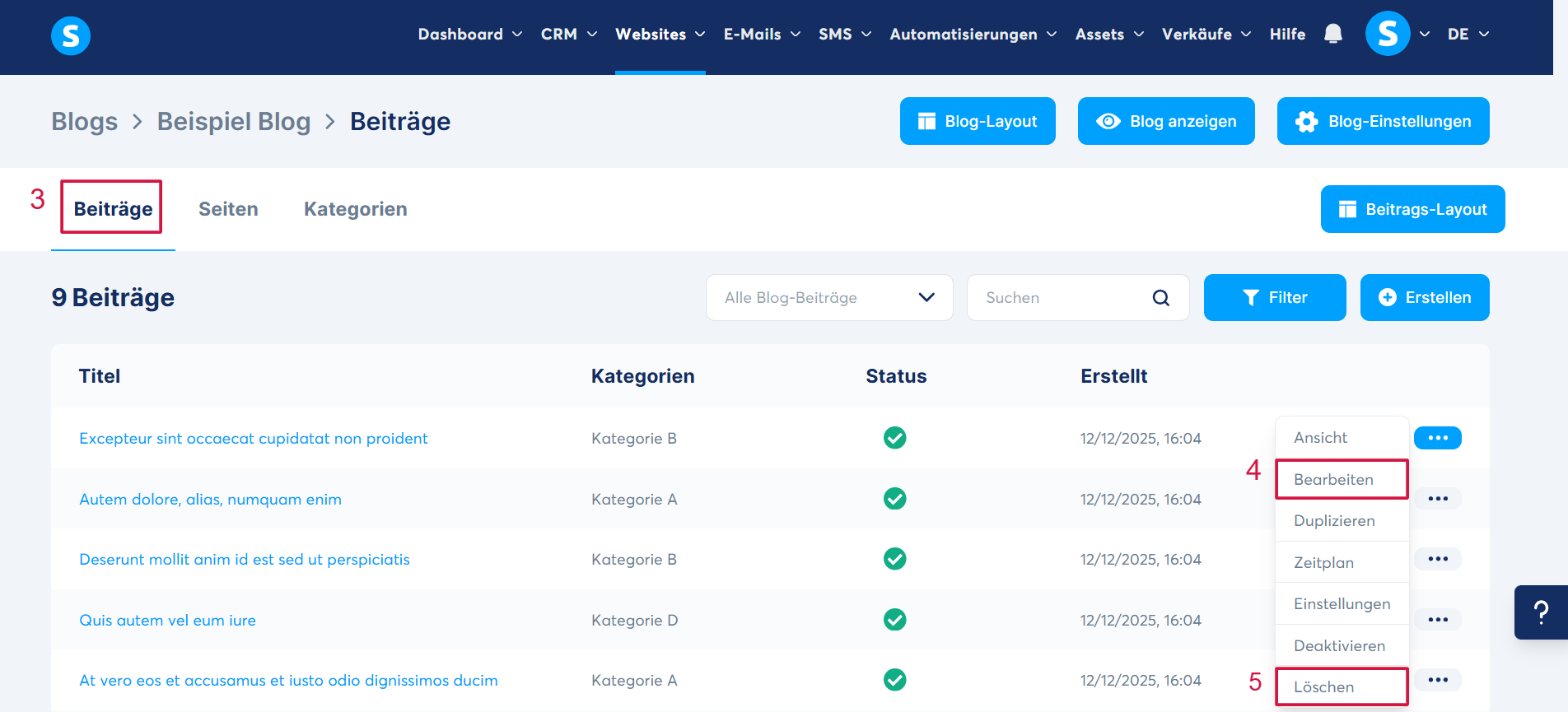 Sobald Sie sich im Menü Ihres Blogs befinden, gehen Sie zum Bereich „Beiträge“ (3). Sie werden feststellen, dass beim Erstellen Ihres Blogs automatisch einige Standardbeiträge angelegt wurden. Diese Beiträge können Sie bearbeiten, indem Sie auf die drei Punkte klicken und „Bearbeiten“ auswählen (4), oder sie löschen, indem Sie auf „Löschen“ klicken (5).