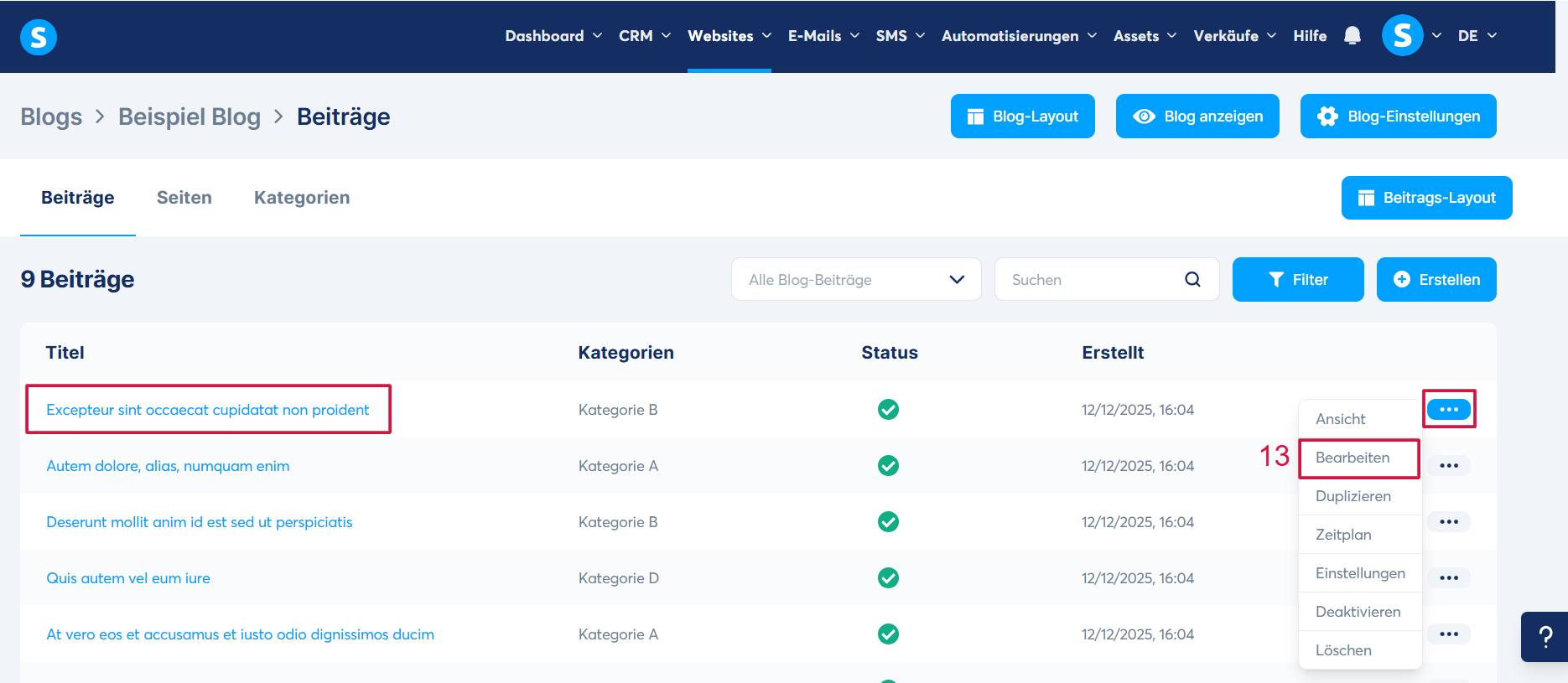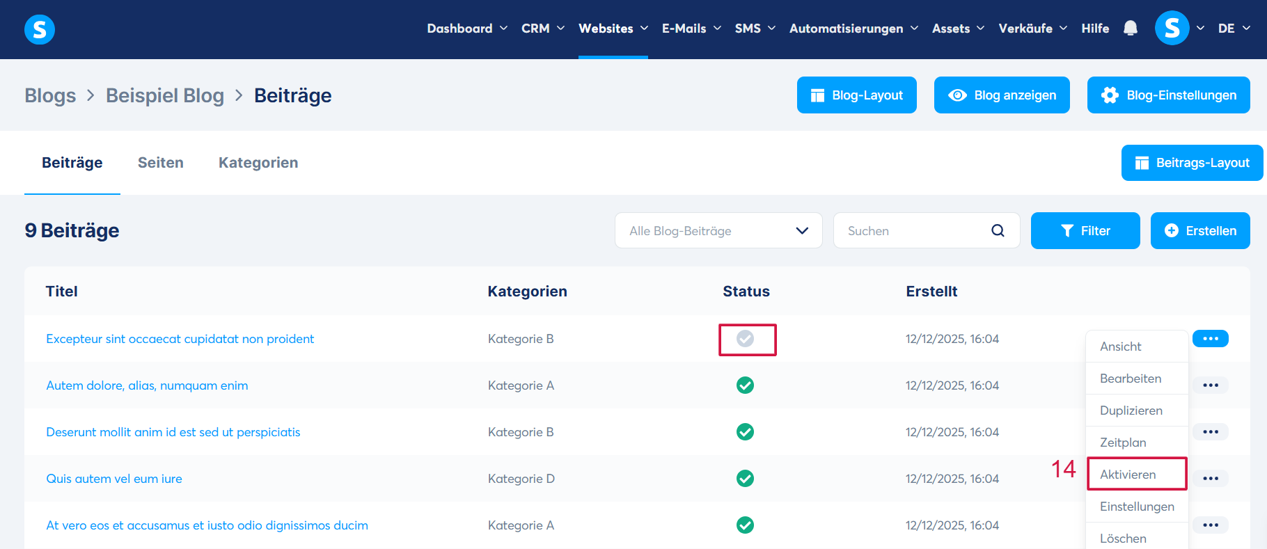 Sobald Sie den Inhalt Ihres Beitrags angepasst haben, klicken Sie erneut auf die drei Punkte und wählen Sie "Aktivieren" (14), um Ihren Beitrag in Ihrem Blog anzuzeigen.