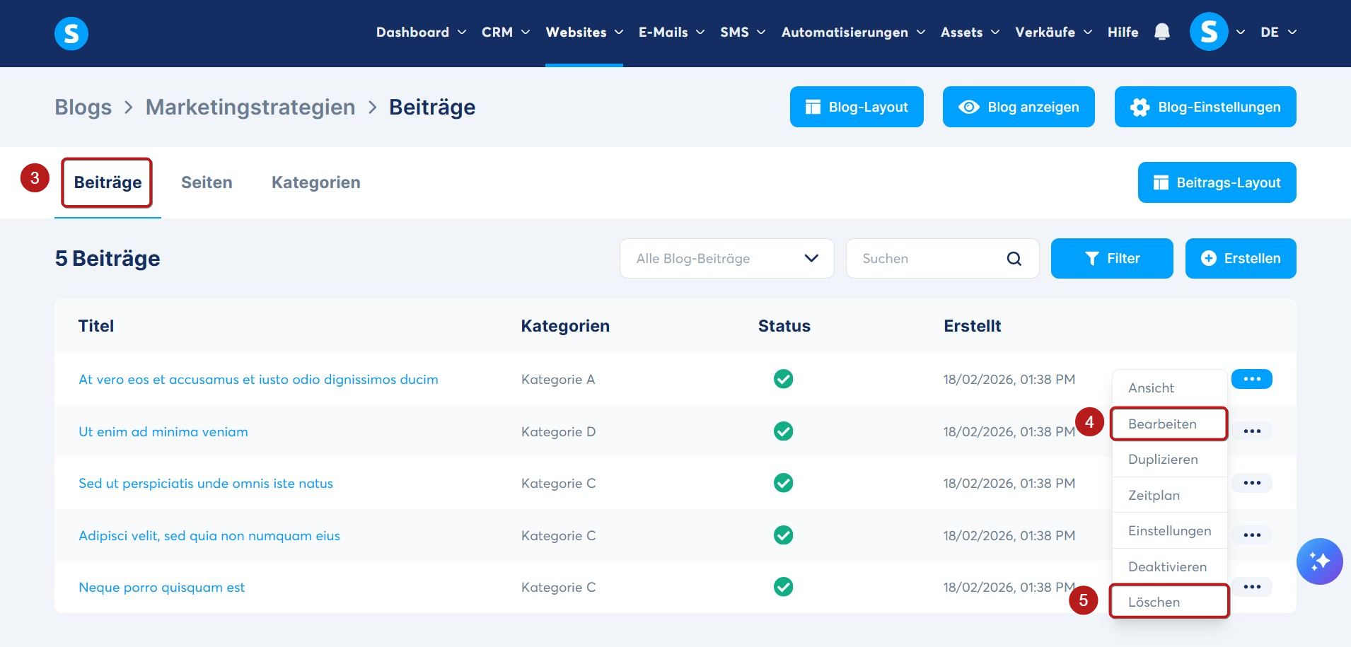 Um diese Beiträge zu bearbeiten, klicken Sie auf die drei Punkte und wählen Bearbeiten (4) oder klicken direkt auf den Beitragstitel. Sie können Beiträge löschen, indem Sie auf Löschen (5) klicken.