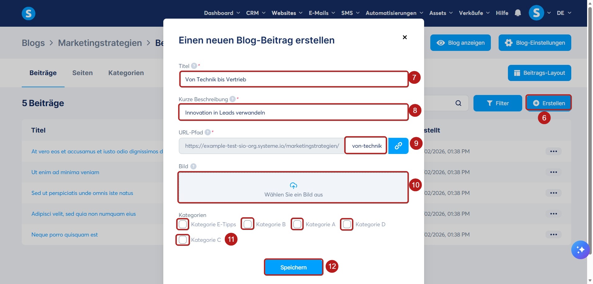 Um einen neuen Blog-Beitrag zu erstellen, klicken Sie auf Erstellen (6). Es erscheint ein Popup-Fenster, in dem Sie die Eingabefelder wie folgt ausfüllen müssen: