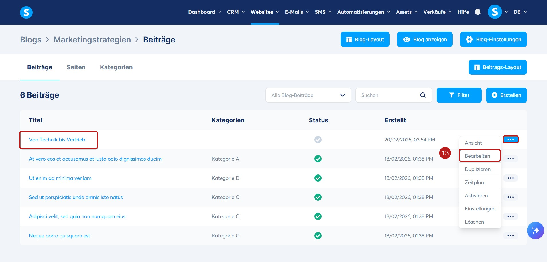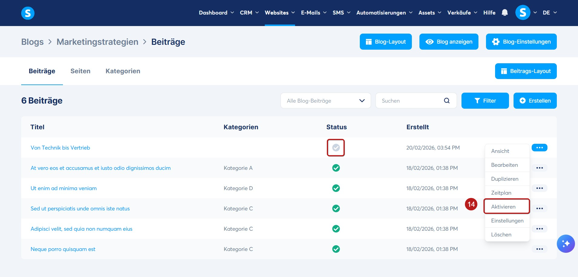 Sobald Sie die Anpassung des Inhalts abgeschlossen haben, klicken Sie erneut auf die drei Punkte und wählen Aktivieren (14), um Ihren Beitrag auf Ihrem Blog anzuzeigen.