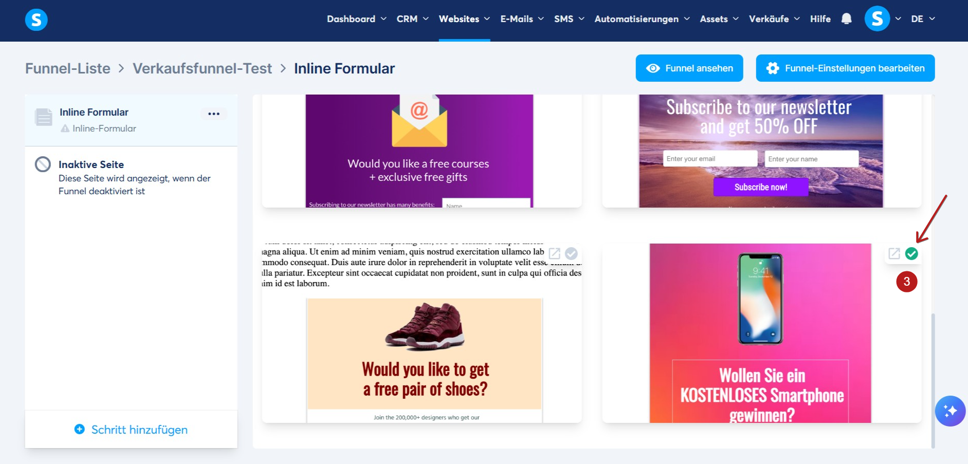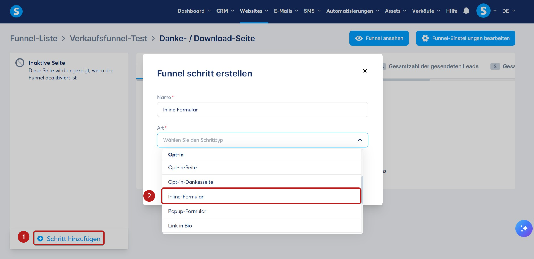 Gehen Sie dazu zu Ihrem Verkaufsfunnel, klicken Sie auf Funnelschritt erstellen (1), um einen neuen Schritt zu erstellen, und wählen Sie anschließend Inline Form (2) aus.