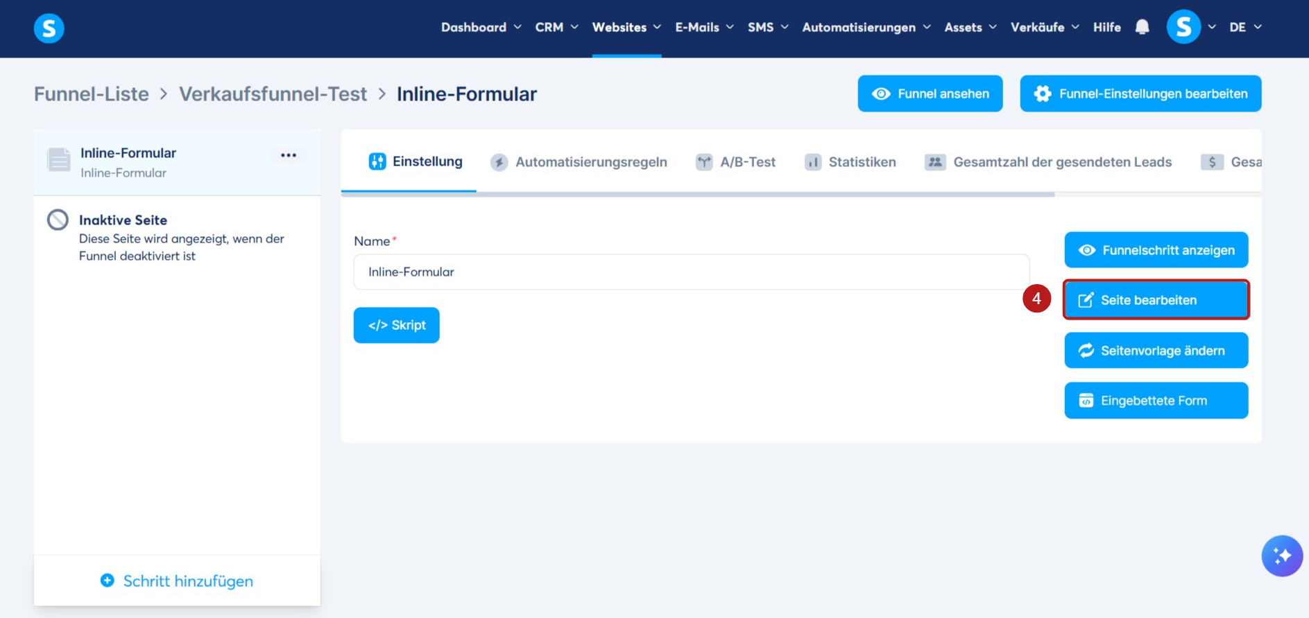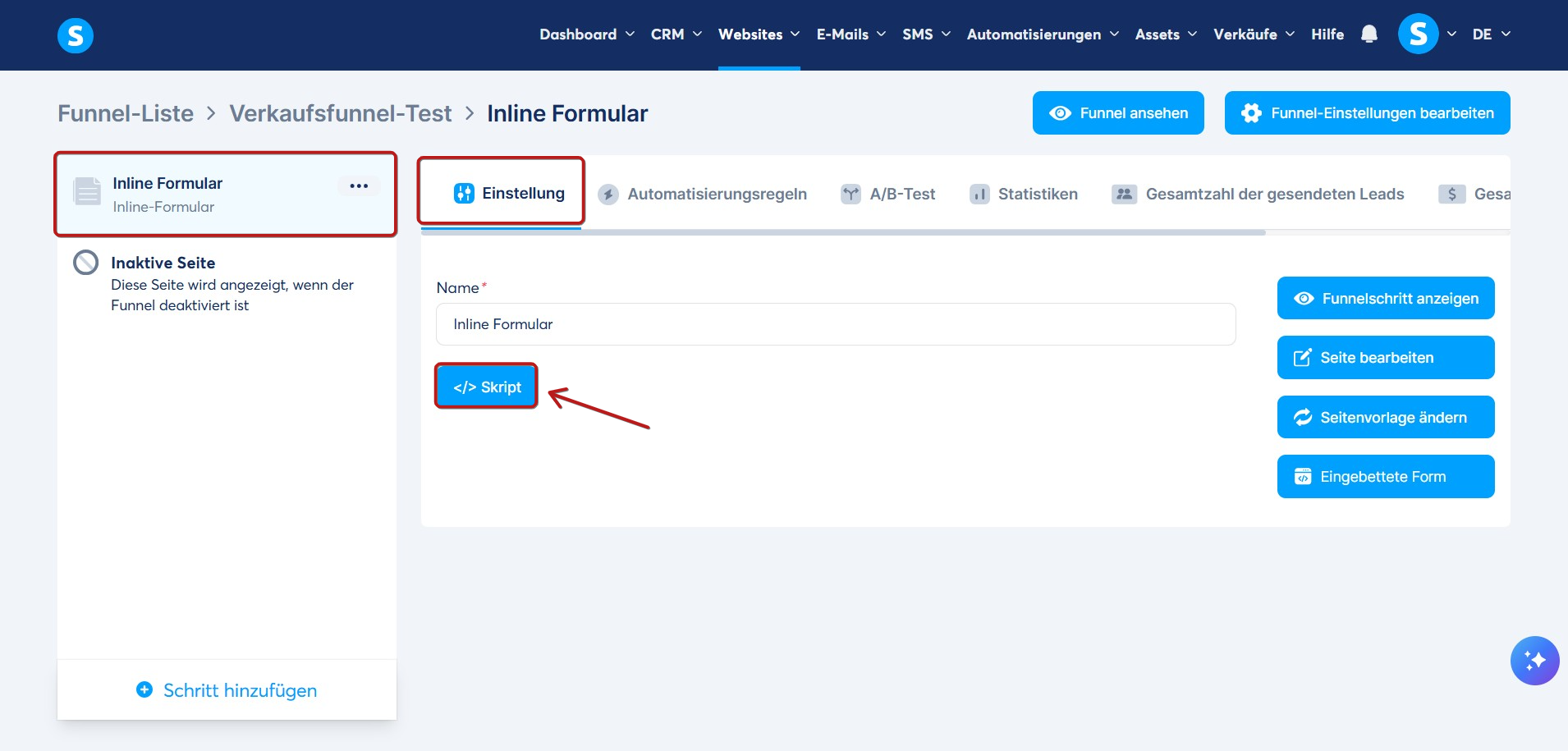 Kehren Sie zunächst zur Schritt-Konfiguration (Einstellung) Ihres Inline-Formulars zurück und klicken Sie anschließend auf Skript.