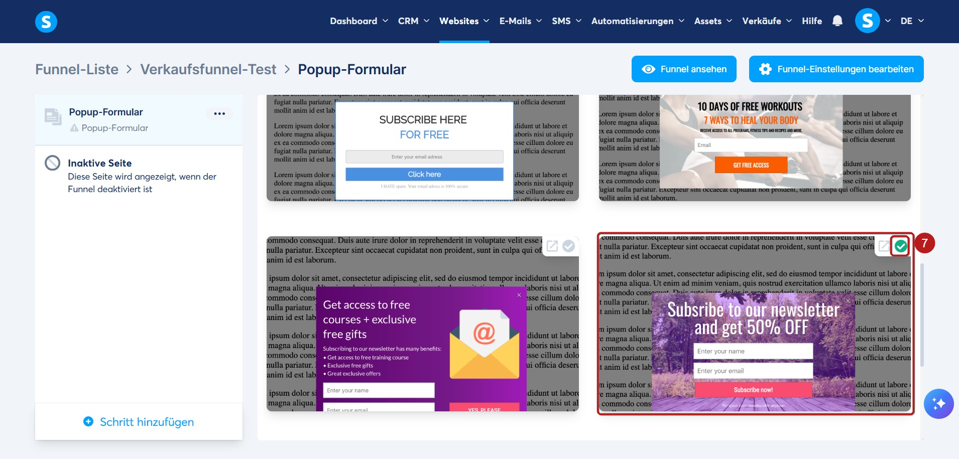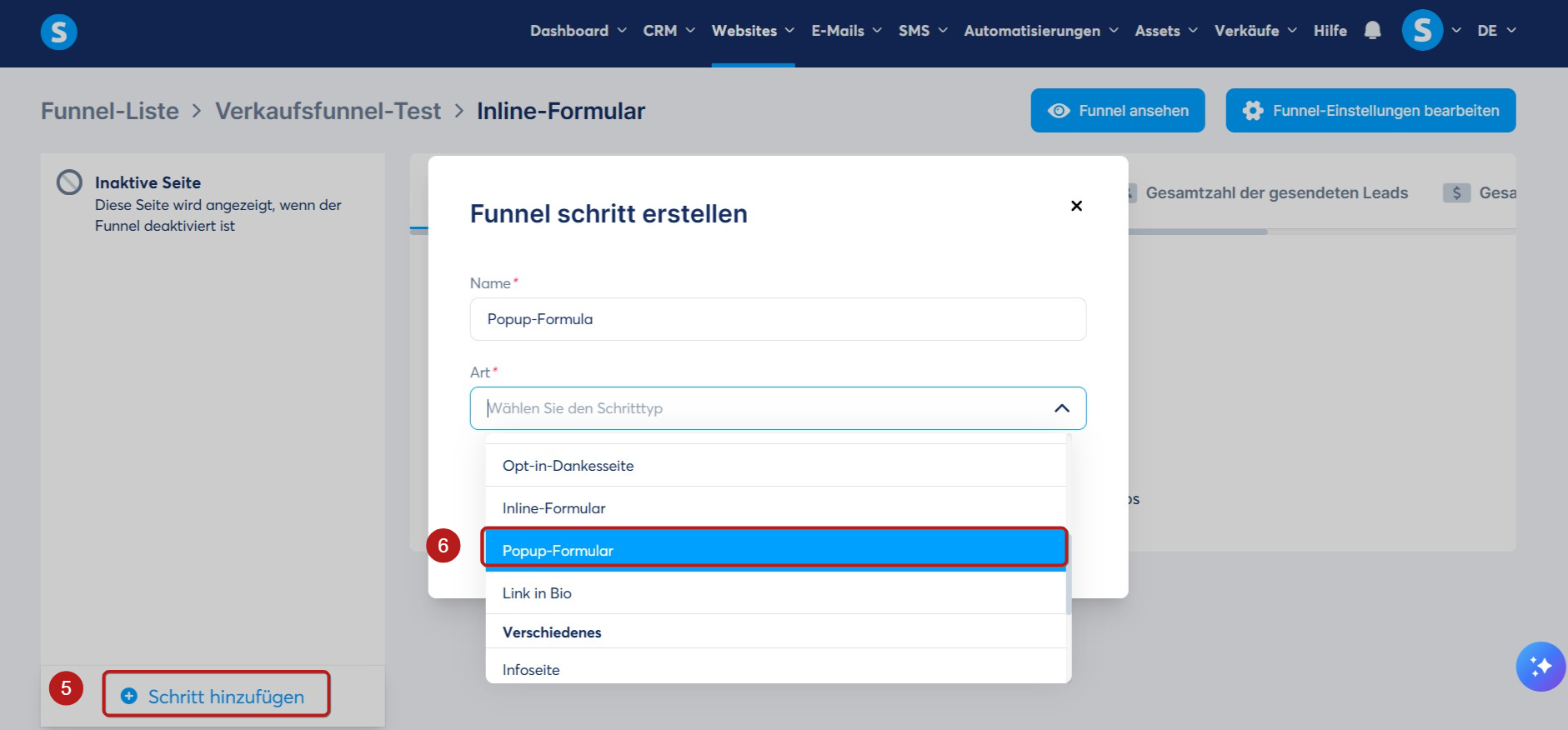 Gehen Sie zu Ihrem Sales Funnel, klicken Sie auf Schritt hinzufügen (5), um einen neuen Schritt zu erstellen, und wählen Sie anschließend Popup-Formular (6) aus.