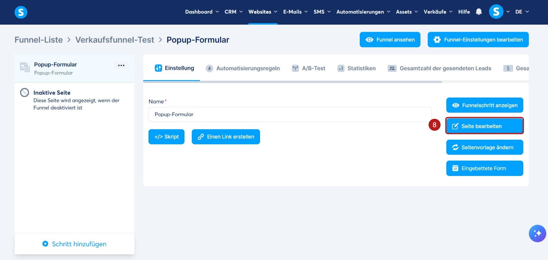 Gehen Sie zum Formularseiten-Editor, indem Sie auf Seite bearbeiten (8) klicken, um Ihr Pop-Up-Formular anzupassen.