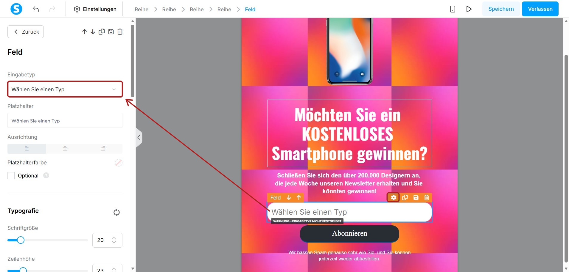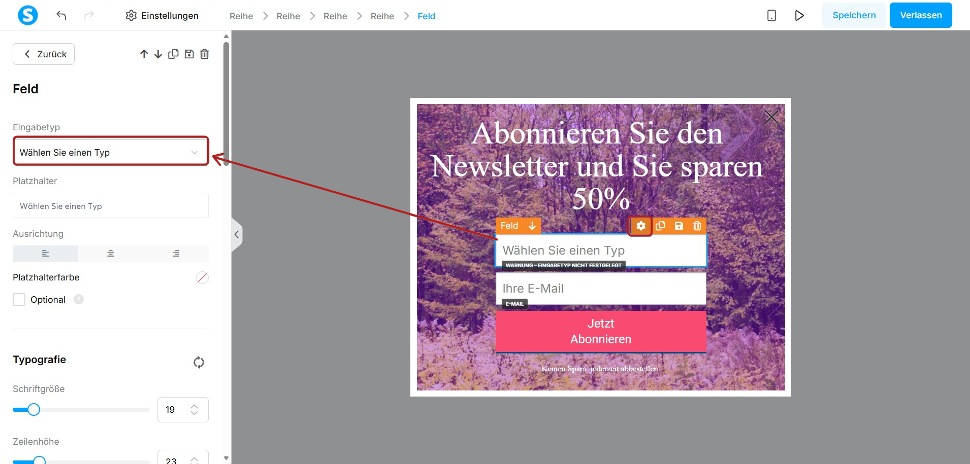Wählen Sie das Element Formularfeld aus. Klicken Sie anschließend auf das Symbol Einstellungen (Zahnrad), um das Feld zu konfigurieren. Wählen Sie im Dropdown-Menü den gewünschten Eingabetyp aus, den Sie erfassen möchten.